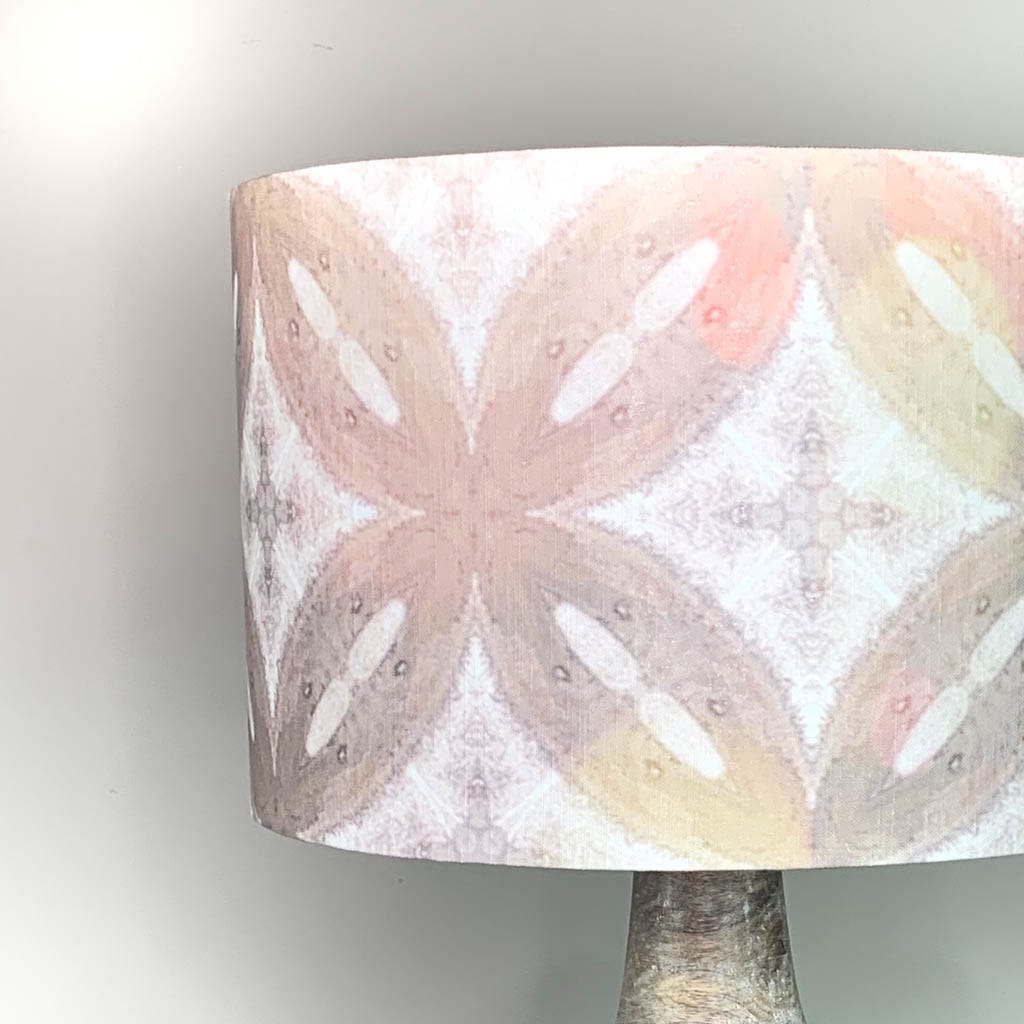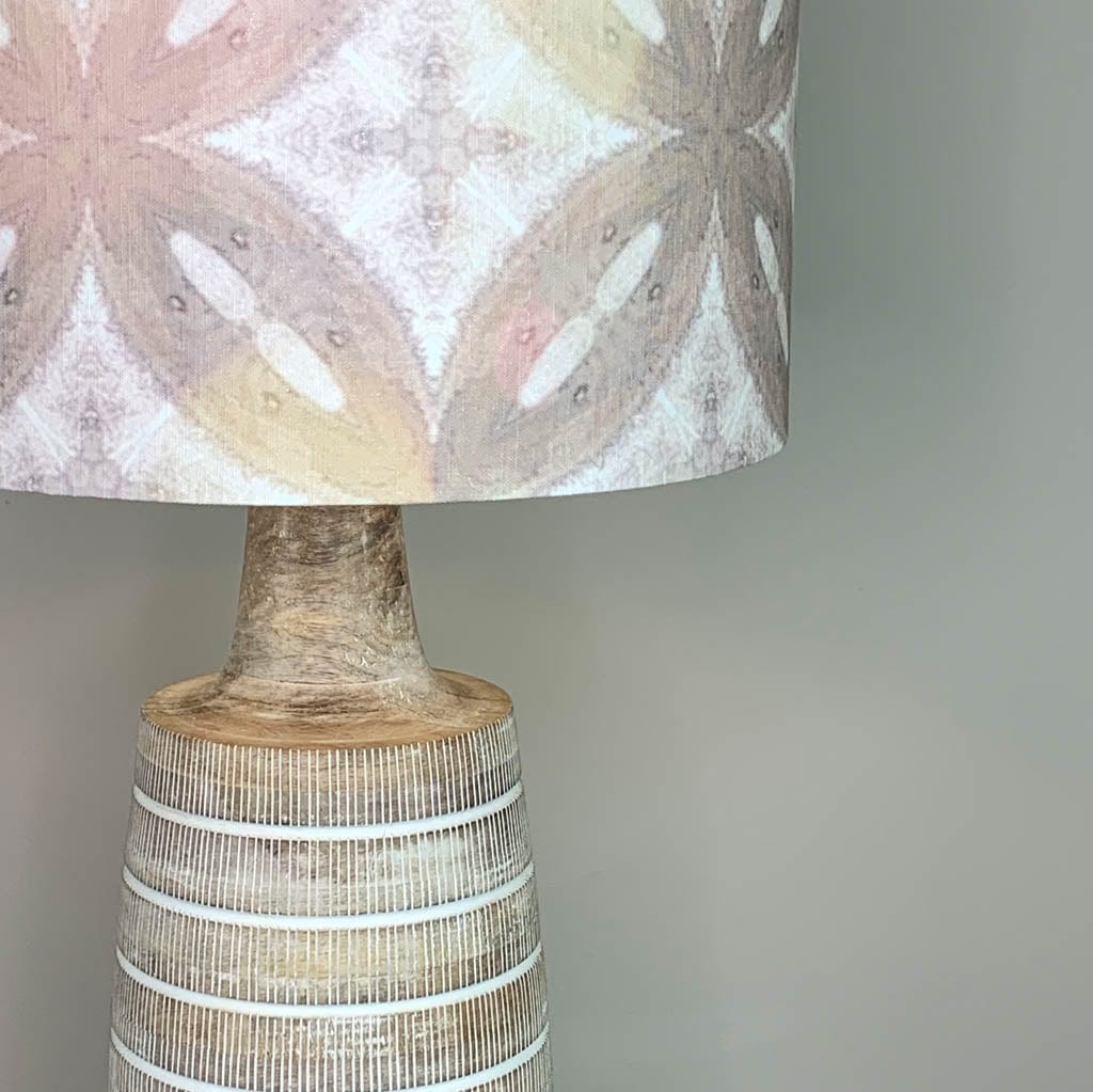 Wooden, white washed, simple and elegant in its design, this Scandi and iconic table lamp when paired with this exquisite linen in a crafted design influenced by architectural and sculptural forms from antiquity and beyond. Julia Clare's Antiquity, in coral complements the shapes & tones within the wooden rustic lamp base. Hand-carved tracery is suggested and tonal intricacies give a 3D stone-relief quality to the design which makes it a beautifully bold alternative to other tile based fabric designs. The glowing coral infusion of colour offers a fresh and eye-catching luminescence which transforms any space especially when paired with our champagne lining.
