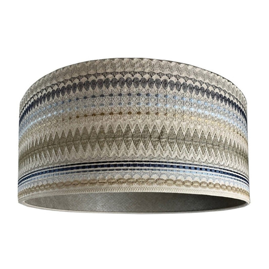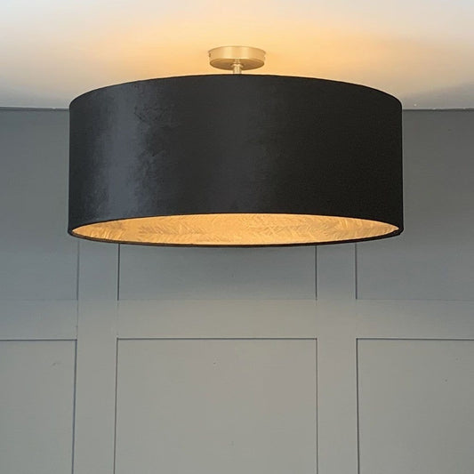 Using light shades for ceiling lights brings colour and texture front and centre of the room? We would always recommend large ceiling shades – an empty ceiling swallows up a small shade. A small shade can look miniscule and even for a small room we would recommend no smaller than a 50cm drum lampshade.