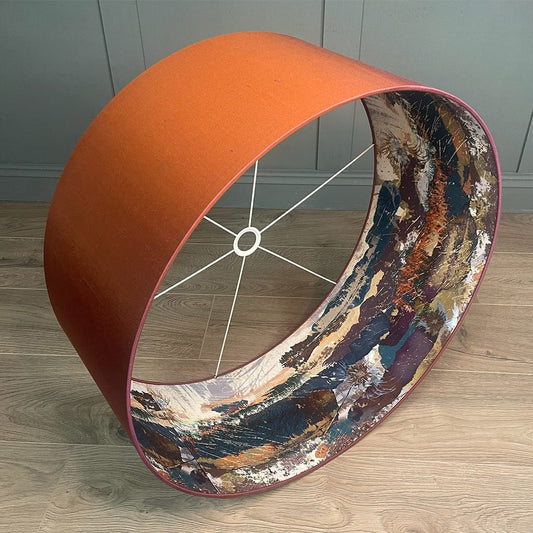 Even if you have a low ceiling you won’t need skimp on the size of ceiling lampshade. Go shallow and wide, seen here in our Mikado Electrified Shade with Anthology Oxidise Lining. This is an extra shallow pendant ceiling light specially designed for lower ceilings with an overall height including rod of only 32cm.