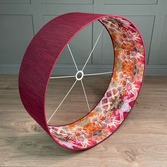 A bright light shade can really cheer up your décor and hence your mood and you don’t get much brighter or cheerier than our Fluffy Rainbow shade with hot pink fabric lining! Or try a little more tropical with our Palmyra Spice fabric on the inside for subtle drama or the outer for a brilliant pop of those jewel tones!