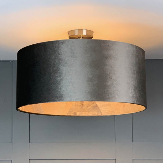 Letino Mercury Grey Velvet Pendant Shade with Arte Formation Grey Wallpaper Lining