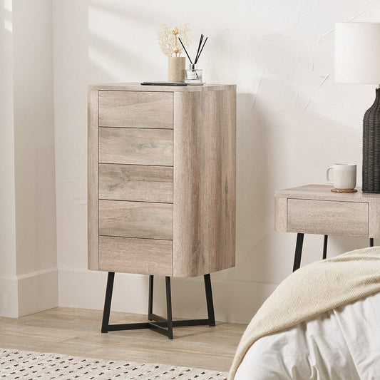 Ukiah Grey Oak Veneer & Black Metal 5 Drawer Tall Boy