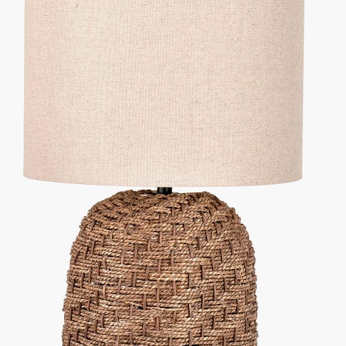 Delight in the stunning woven seagrass floor lamp, beautifully handcrafted in a luxurious brown shade. The natural woven texture adds a tactile element to your living space. Admire the flawless base, topped with a tall, cream linen lampshade featuring a charming textured design.
