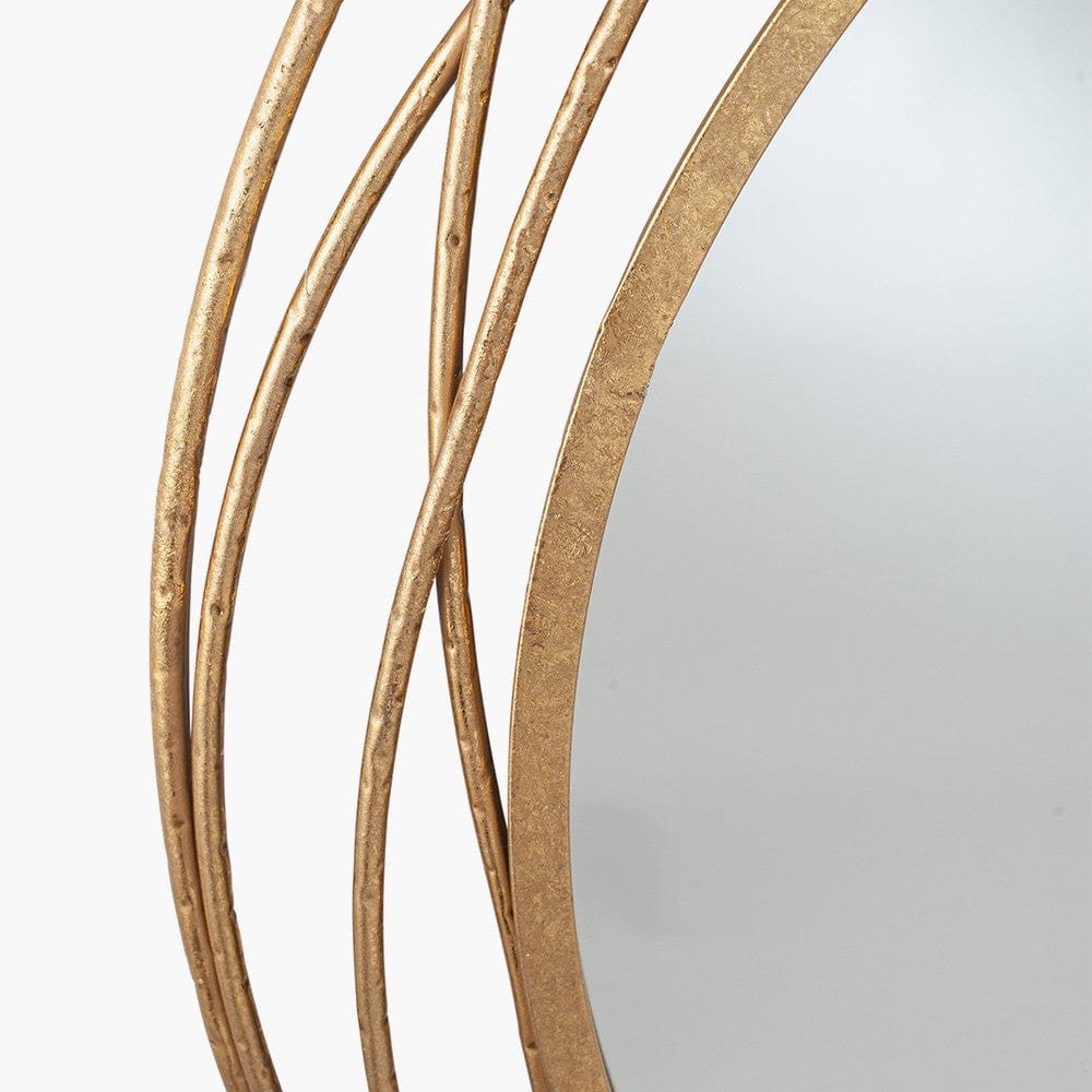 Striking and modern this mirror has a sculptural, swirling circles metal frame finished in a modern antique gold finish. This mirror is both subtle and a talking point within your home and will suit most interiors.