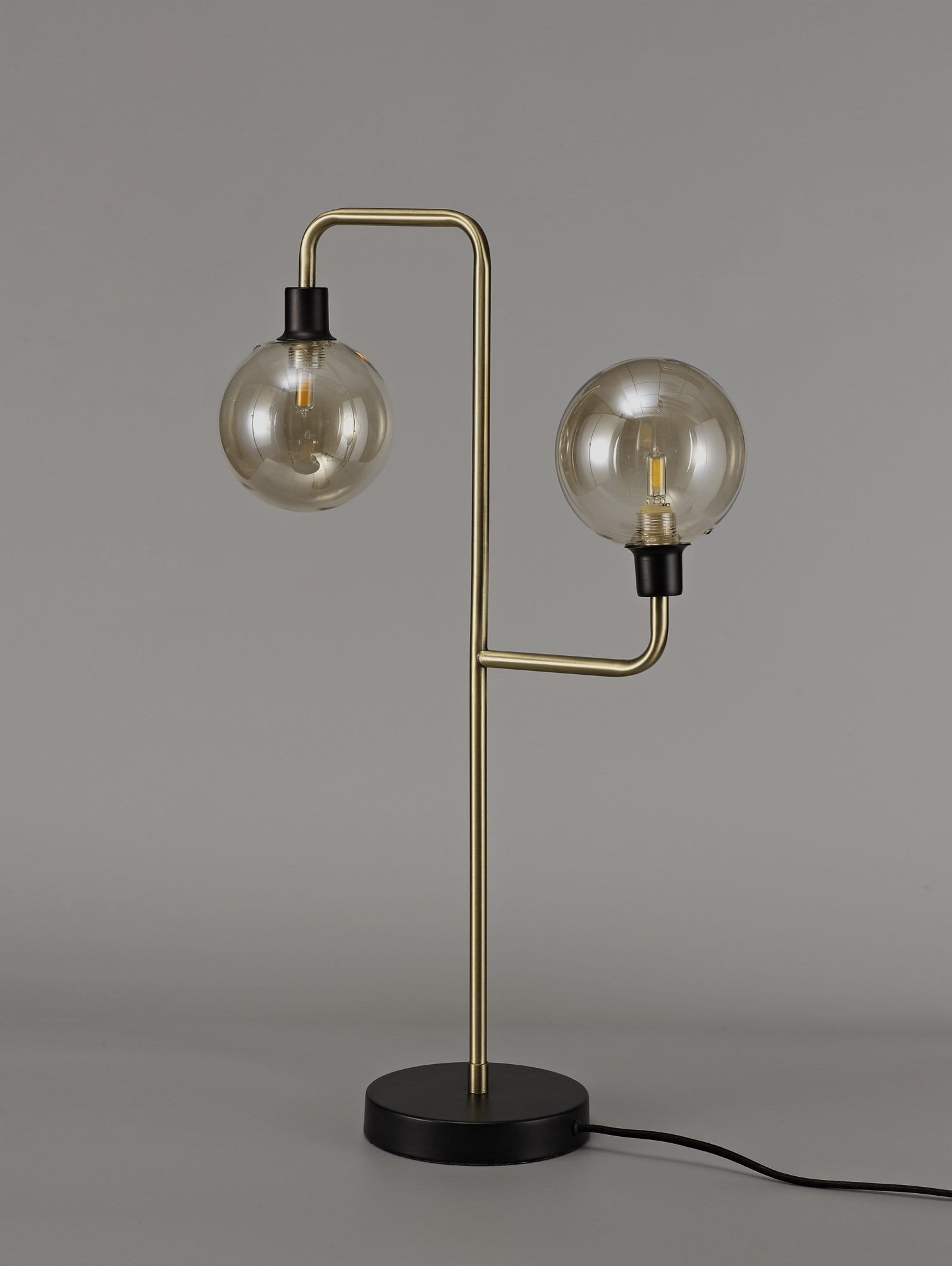 The Atom table lamp features a matt black frame with antique brass tubes, giving it an industrial, repurposed material look. The G9 lampholders are housed within a globe glass for an urban feel.