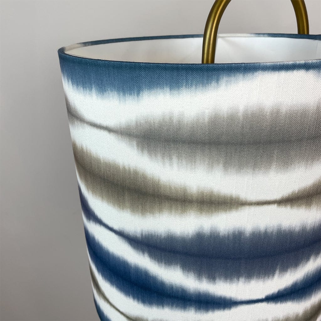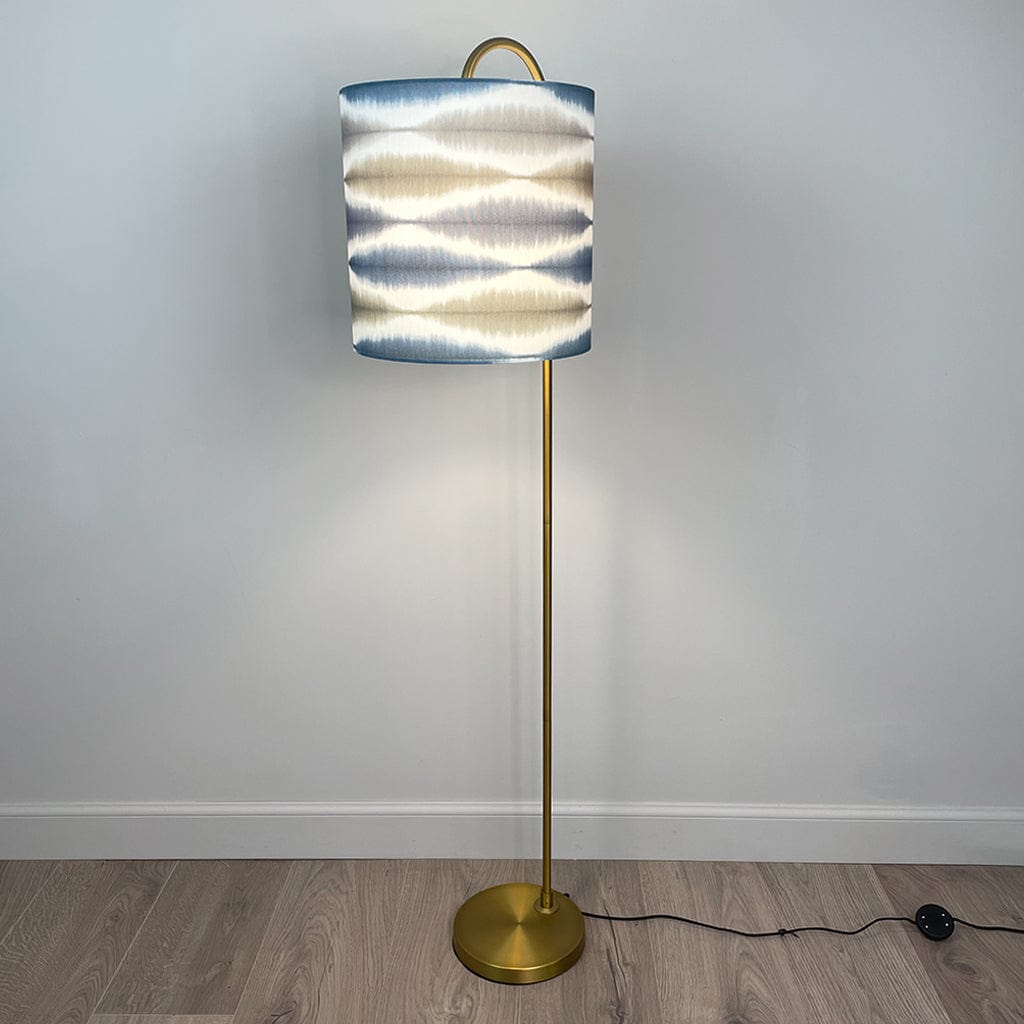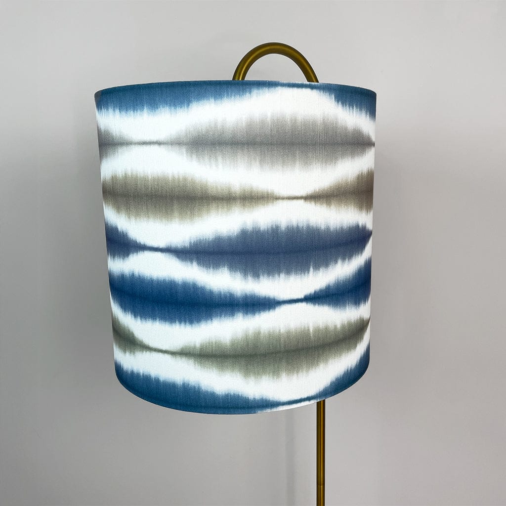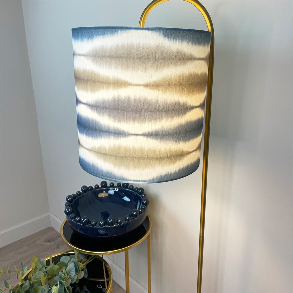 This Idra floor lamp is a slim and modern floor lamp with an oversize J arm. Finished in satin black, this is a statement piece perfect for a cosy corner or behind a chair. We have paired with a cylinder shade in showcasing a rhythmic ikat-inspired pattern in calming tones of slate blue, ink, and neutral beige. The shade’s matt white lining softly diffuses the light allowing the fabric to glow and colours to pop when lit.