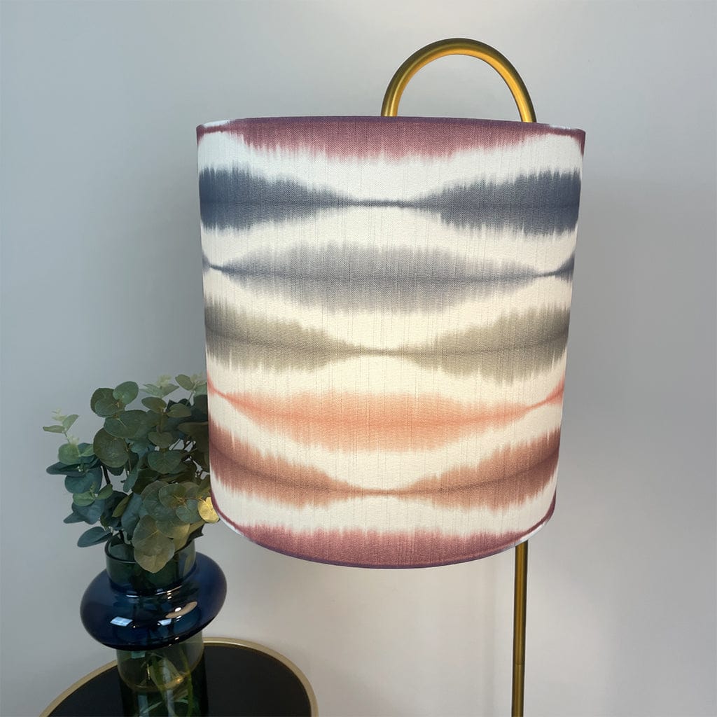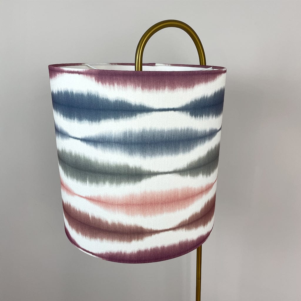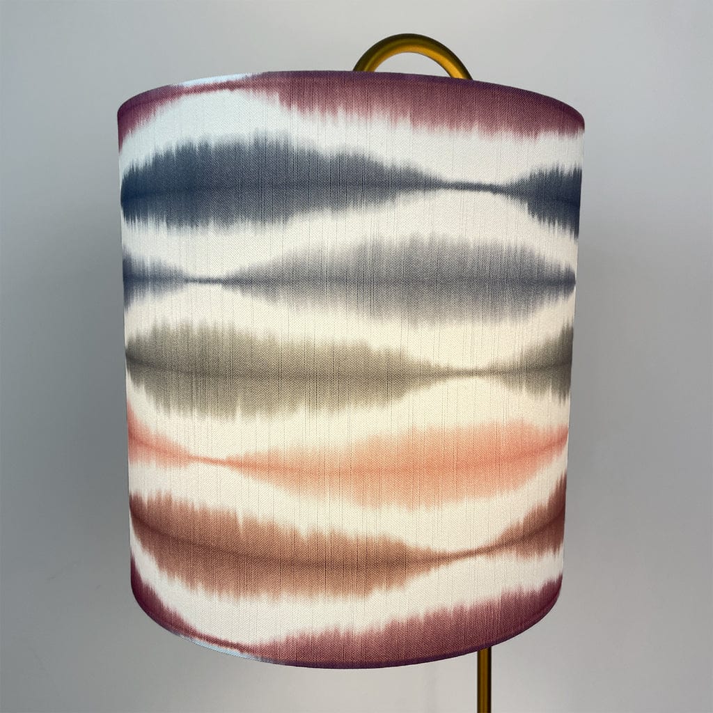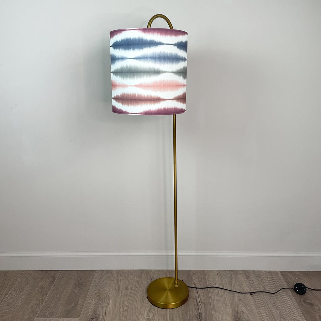 This Idra floor lamp is a slim and modern floor lamp with an oversize J arm. Finished in satin black, this is a statement piece perfect for a cosy corner or behind a chair. We have paired with a cylinder shade in showcasing a rhythmic ikat-inspired pattern in calming tones of soft cranberry, rose, navy and sage tones. The shade’s matt white lining softly diffuses the light allowing the fabric to glow and colours to pop when lit.