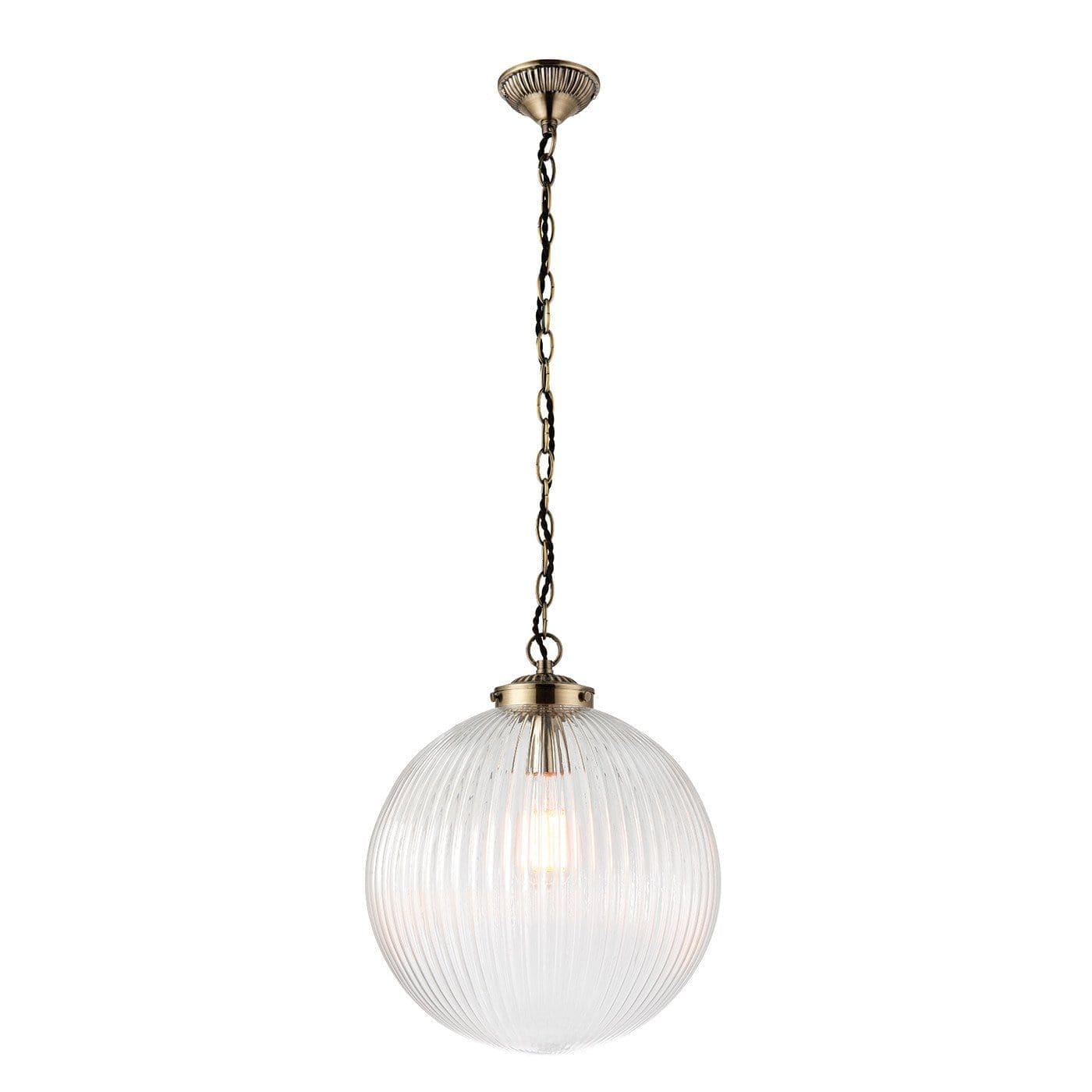 The Brydon ceiling pendant features a ribbed round glass shade hanging from a decorative chain finished in antique brass. Compatible with LED lamps, this fitting can also be dimmed.