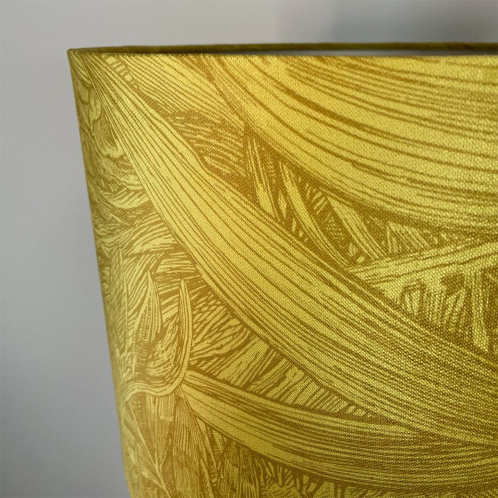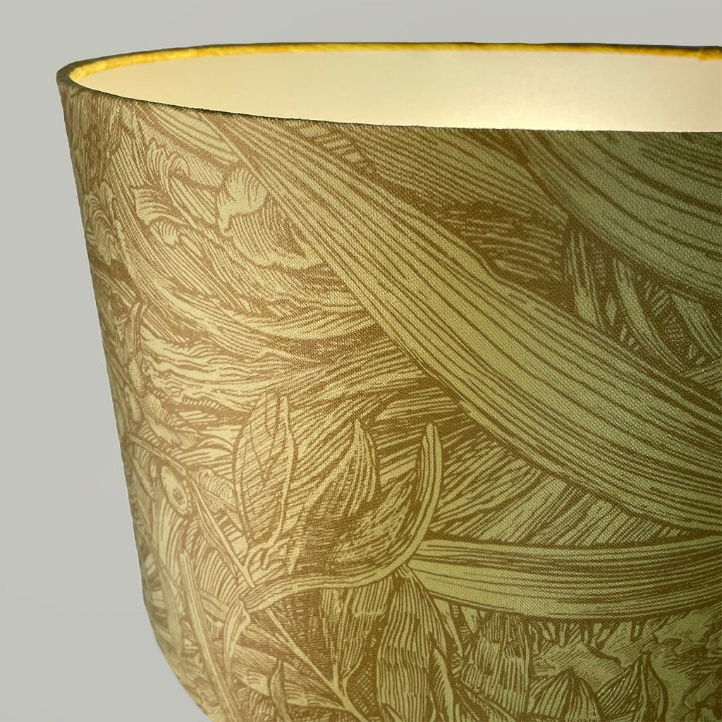 This stunning floor lamp and shade combination features the Timorous Beasties x Panaz Jungle Tangle fabric in a vibrant lemon velvet. At first glance, the design appears subtle, but closer inspection reveals intricate botanical illustrations that bring the fabric to life in true Timorous Beasties style. Paired with the Canterbury antique brass floor lamp—a classic candlestick silhouette with a warm, artisanal finish—this pairing perfectly balances bold pattern and timeless craftsmanship. The lampshade is lined with a champagne backing that enhances the neutral tones and preserves the detailed pattern whether the lamp is lit or unlit, making it a versatile and elegant addition to any interior.