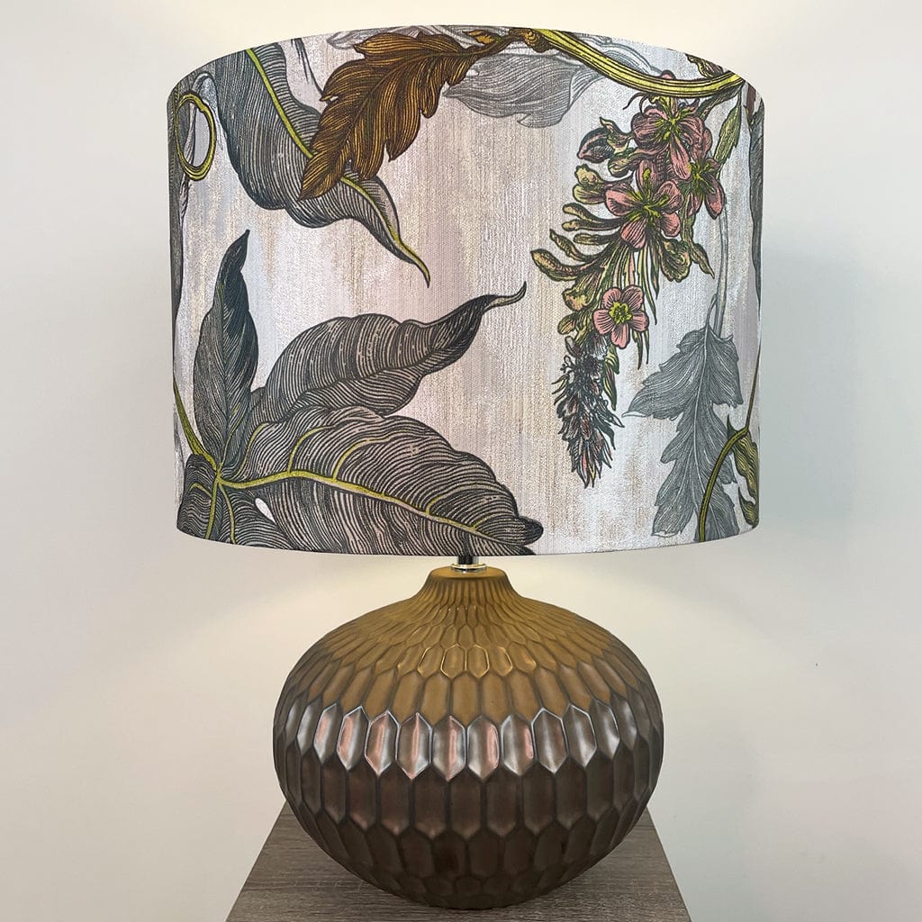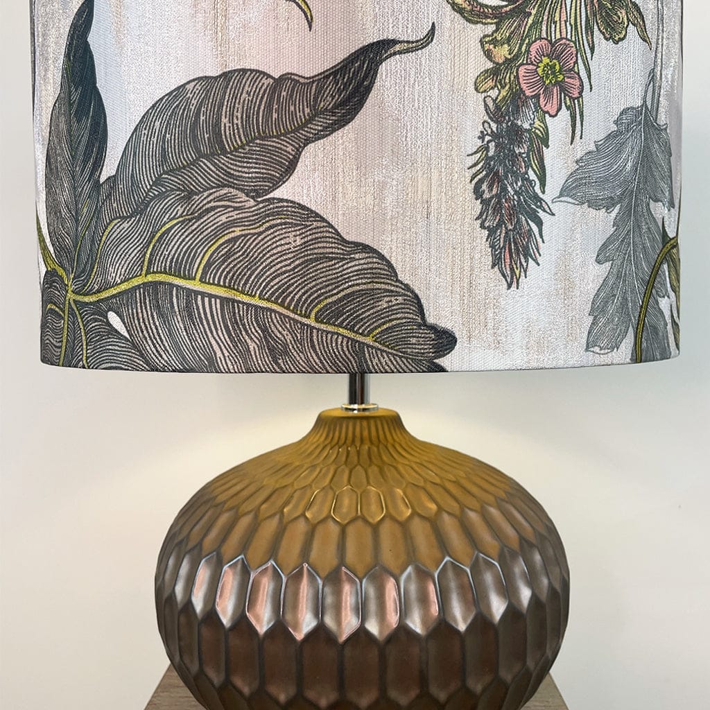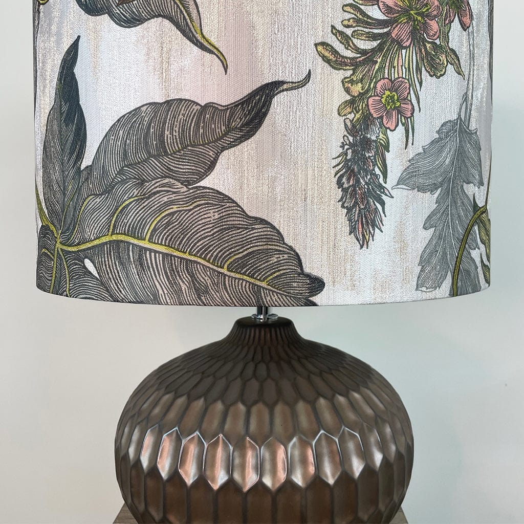 Elevate your space with this ceramic lamp in hand-applied metallic bronze finish, paired with a Rocke Bespoke drum lampshade in Timorous Beasties Epic Botanic Beige Peach fabric. The bold botanical jacquard shade with warm ochres and peaches complements the textured bronze base, adding warmth and sophistication to your décor.