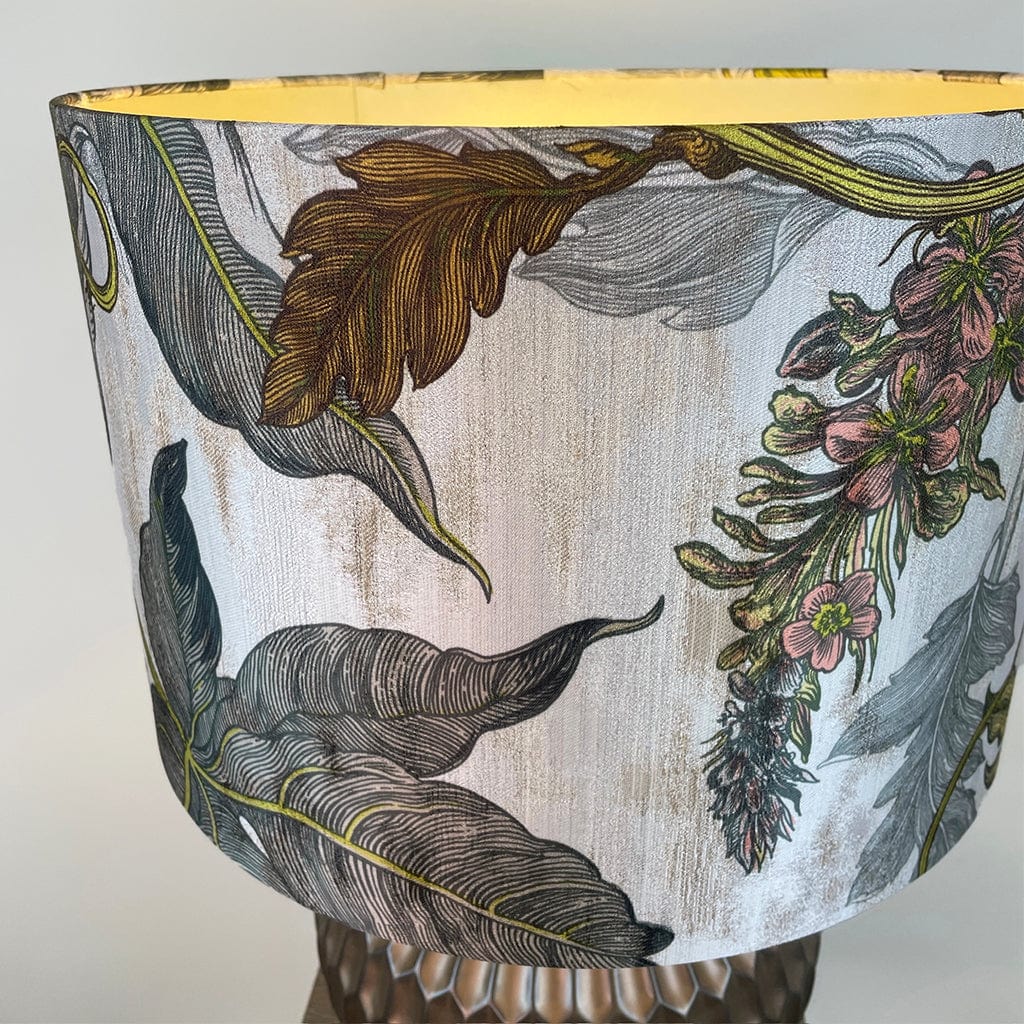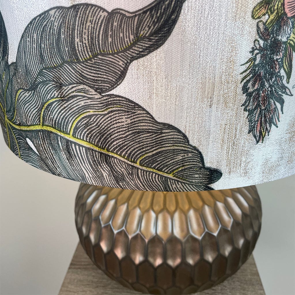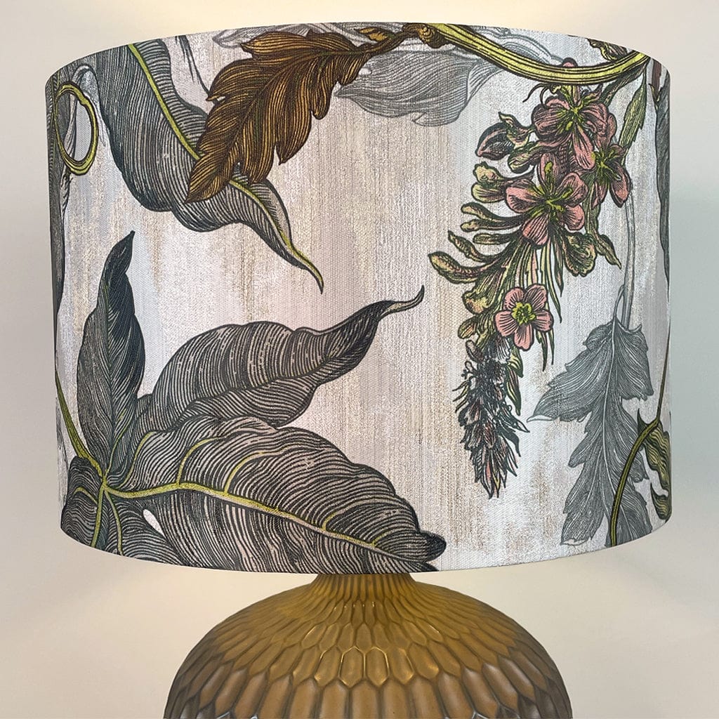 Elevate your space with this ceramic lamp in hand-applied metallic bronze finish, paired with a Rocke Bespoke drum lampshade in Timorous Beasties Epic Botanic Beige Peach fabric. The bold botanical jacquard shade with warm ochres and peaches complements the textured bronze base, adding warmth and sophistication to your décor.