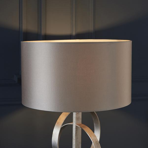 Contemporary glamour doesnβt come much better than this. A sculptural and stylish metalwork double hoop finished in a warm antique silver leaf sits atop a black marble base. Crowned by a warm mink satin drum lampshade lined with a colour matching lining. Charleston is a warm and sophisticated table lamp. A pair of these on a large console table would make a strong design statement.
