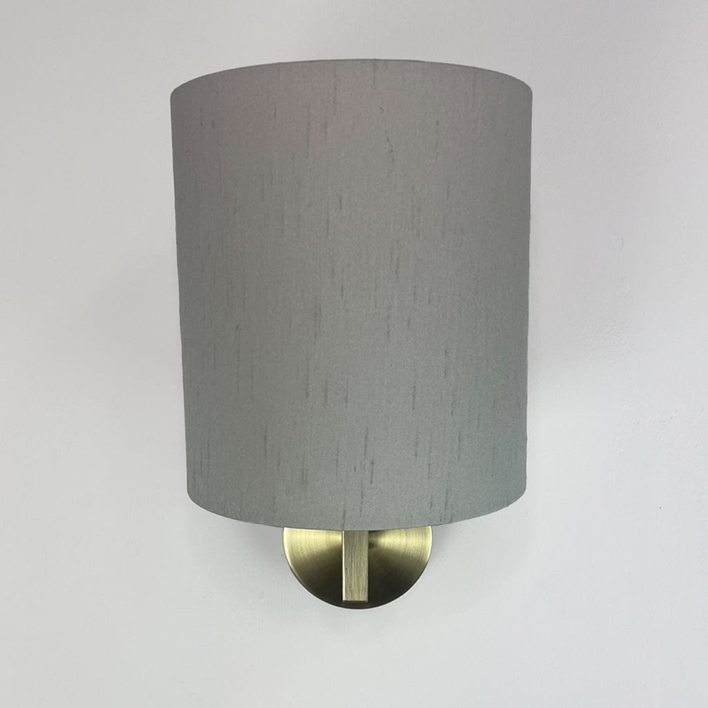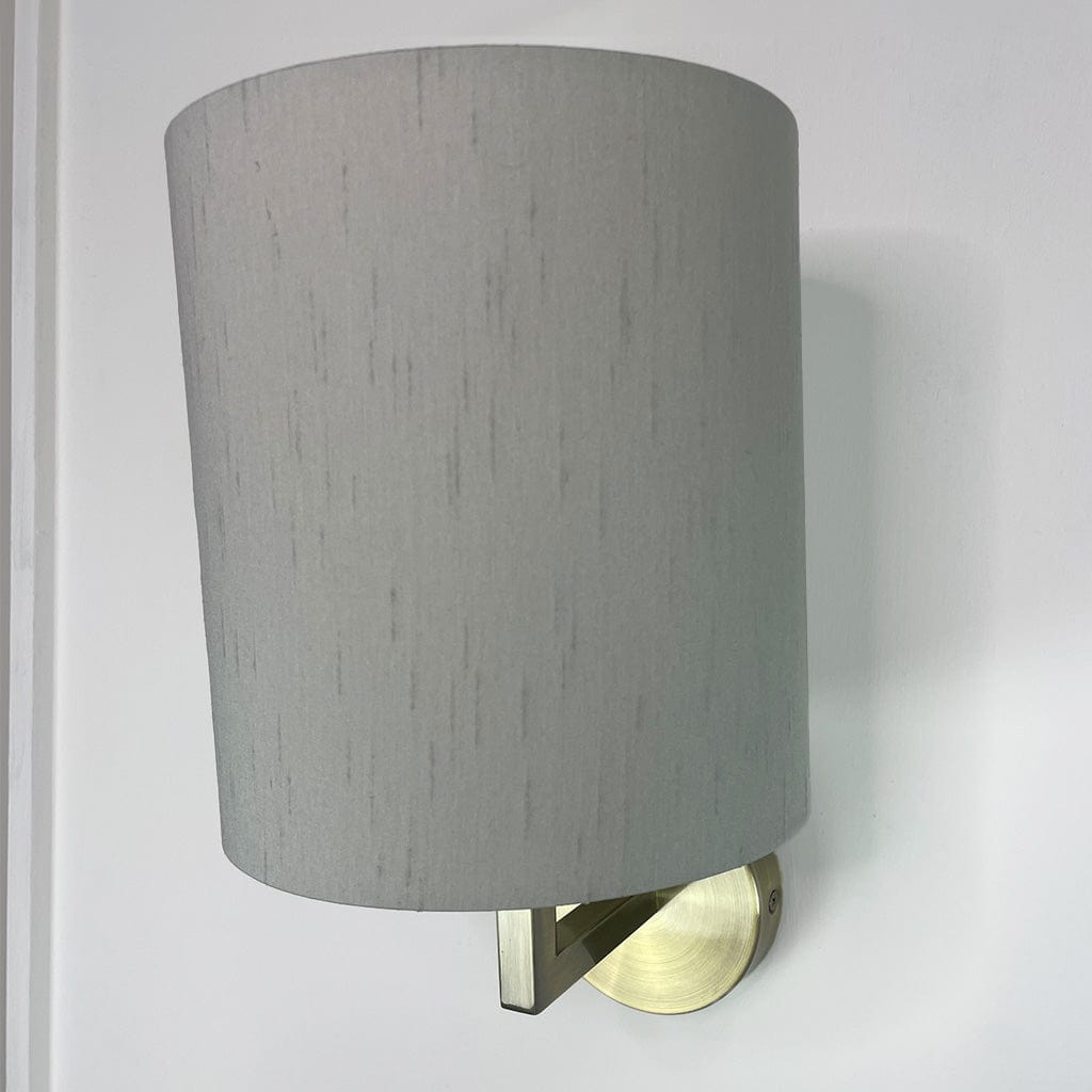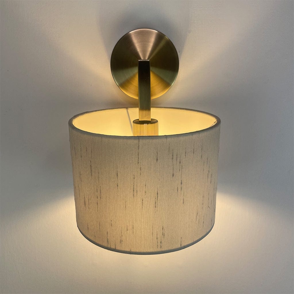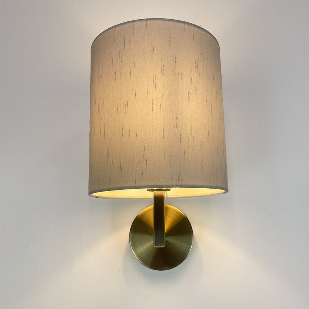 Our very own Emma wall light in an antique brass finish with a Rocke Bespoke shade. This shade has been made in the shade Stockholm, an off-white/grey, with a white lining for maximum glow. We have made a drum shade in two different sizes: a traditional drum height of 13cm or a taller drum with a 20cm height for a more modern look.