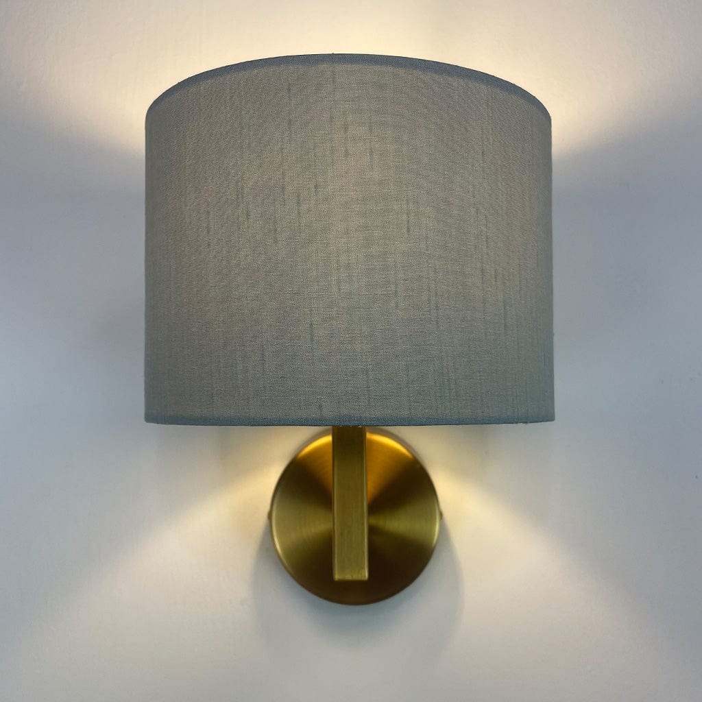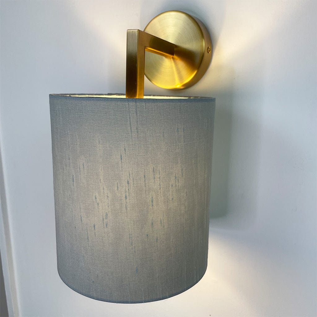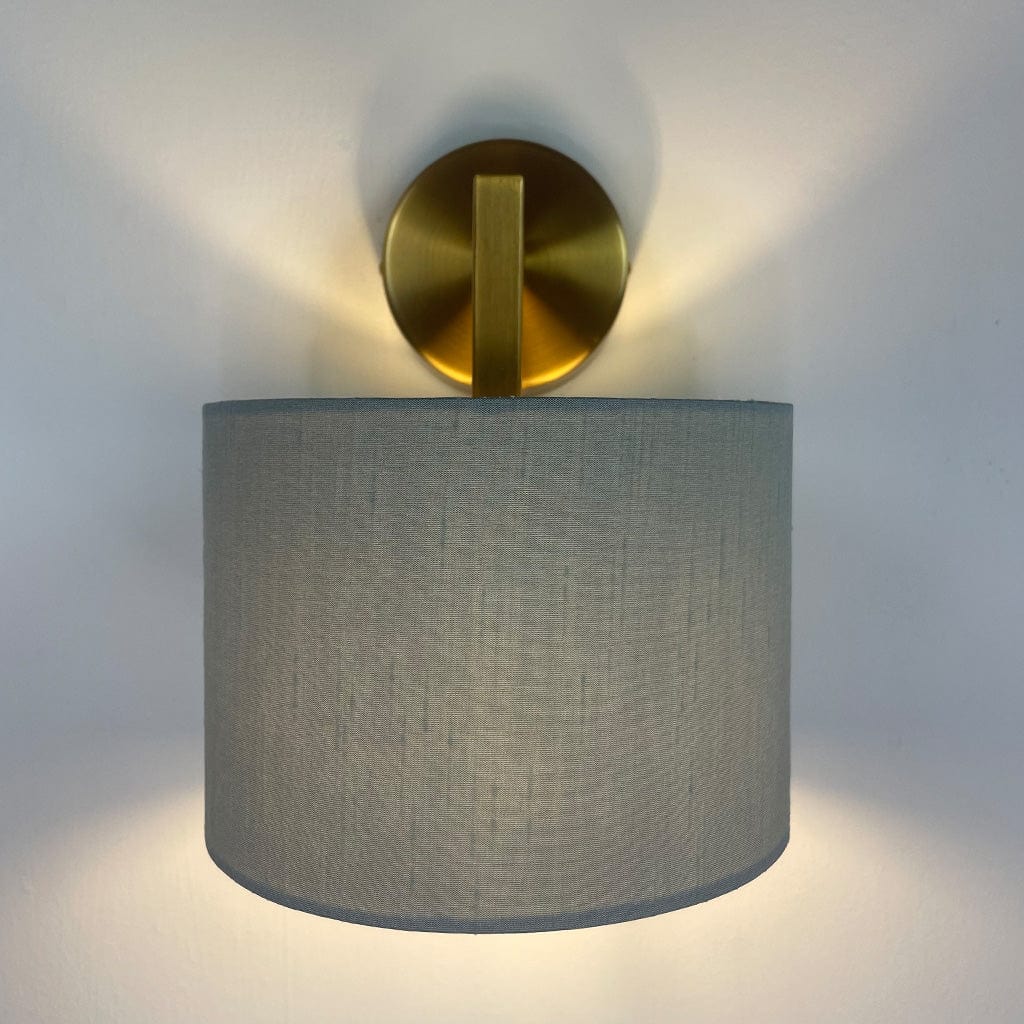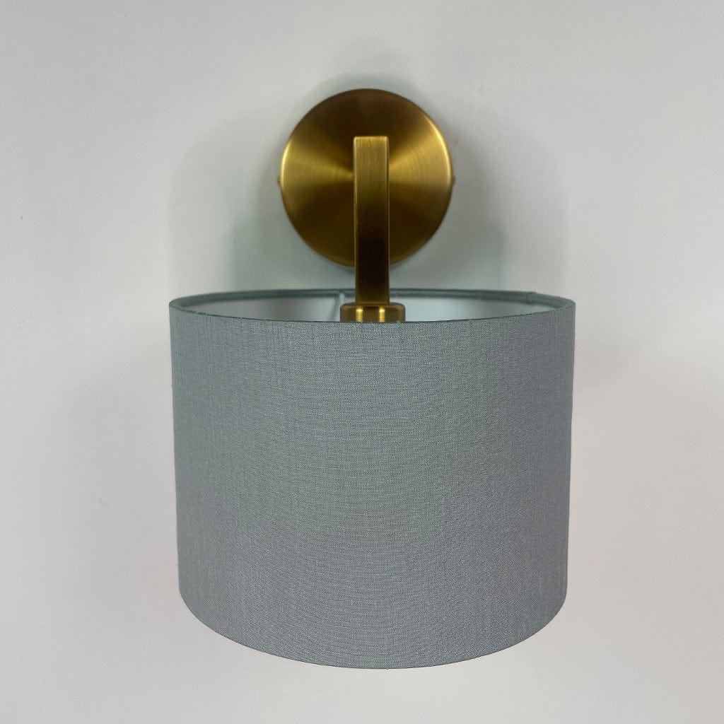 Our own Emma wall light in a gold finish with a Rocke Bespoke shade. This shade has been made in the shade Rainstorm, a light grey, with a white lining for maximum glow. We have made a drum shade in two different sizes: a traditional drum height of 13cm or a taller drum with a 20cm height for a more modern look.