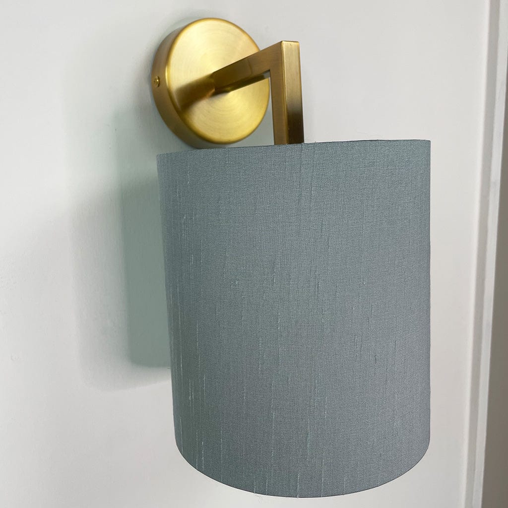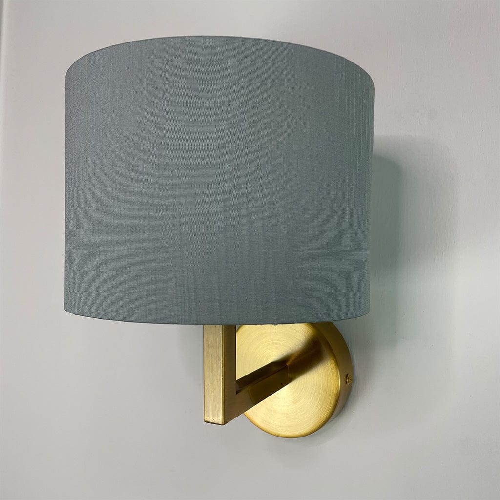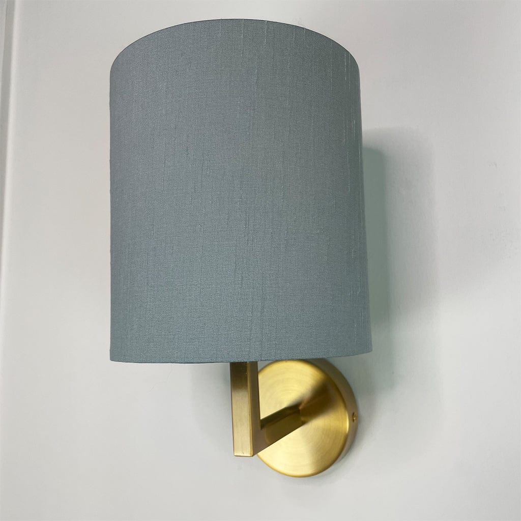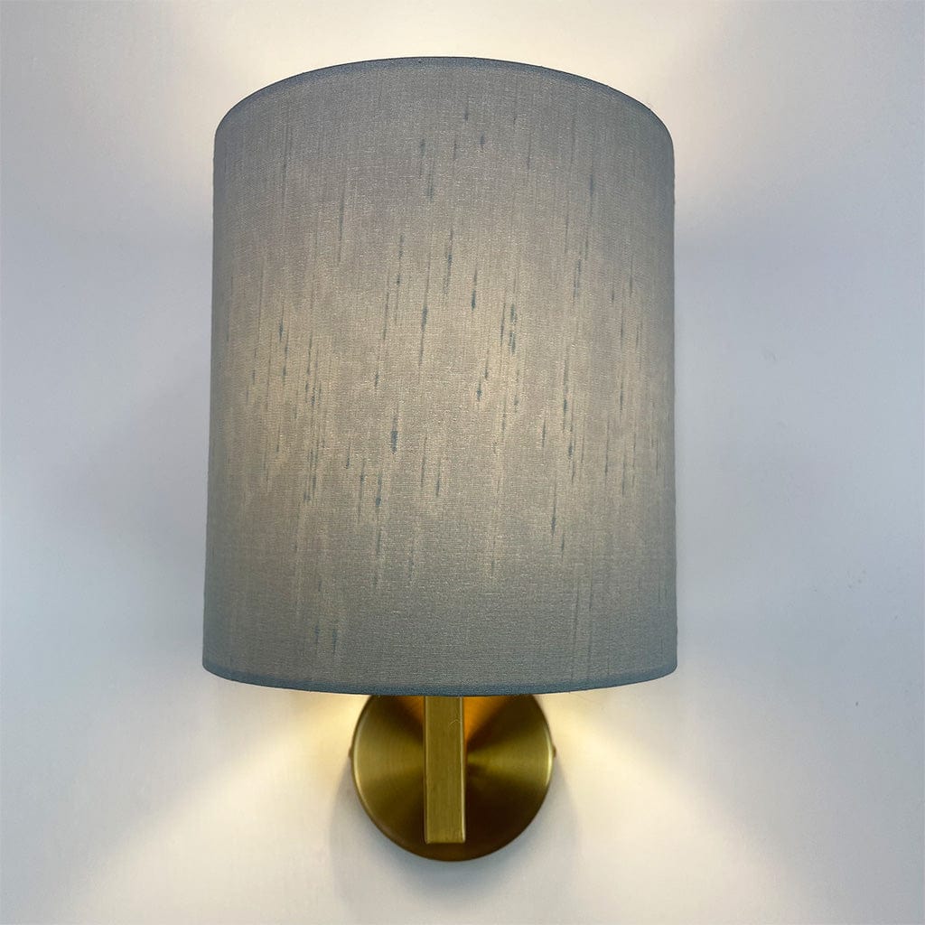 Our own Emma wall light in a gold finish with a Rocke Bespoke shade. This shade has been made in the shade Rainstorm, a light grey, with a white lining for maximum glow. We have made a drum shade in two different sizes: a traditional drum height of 13cm or a taller drum with a 20cm height for a more modern look.