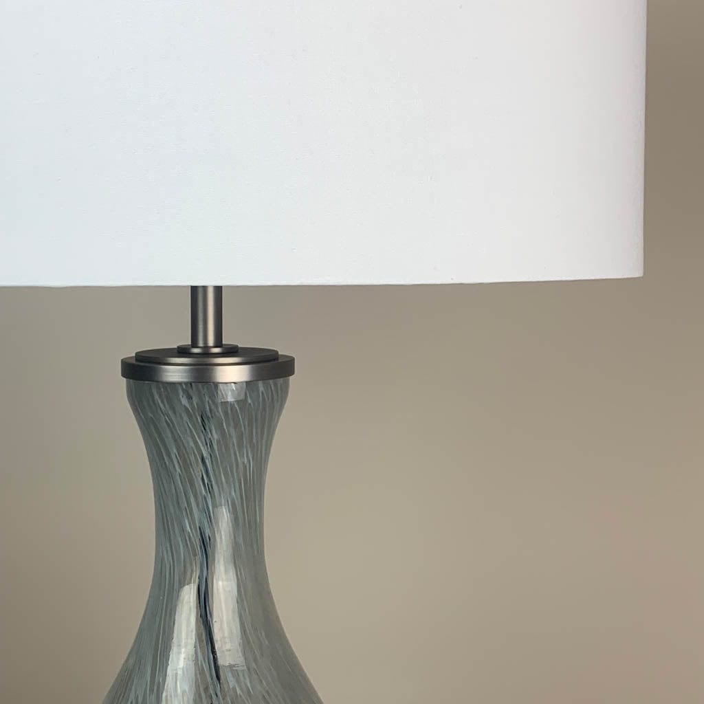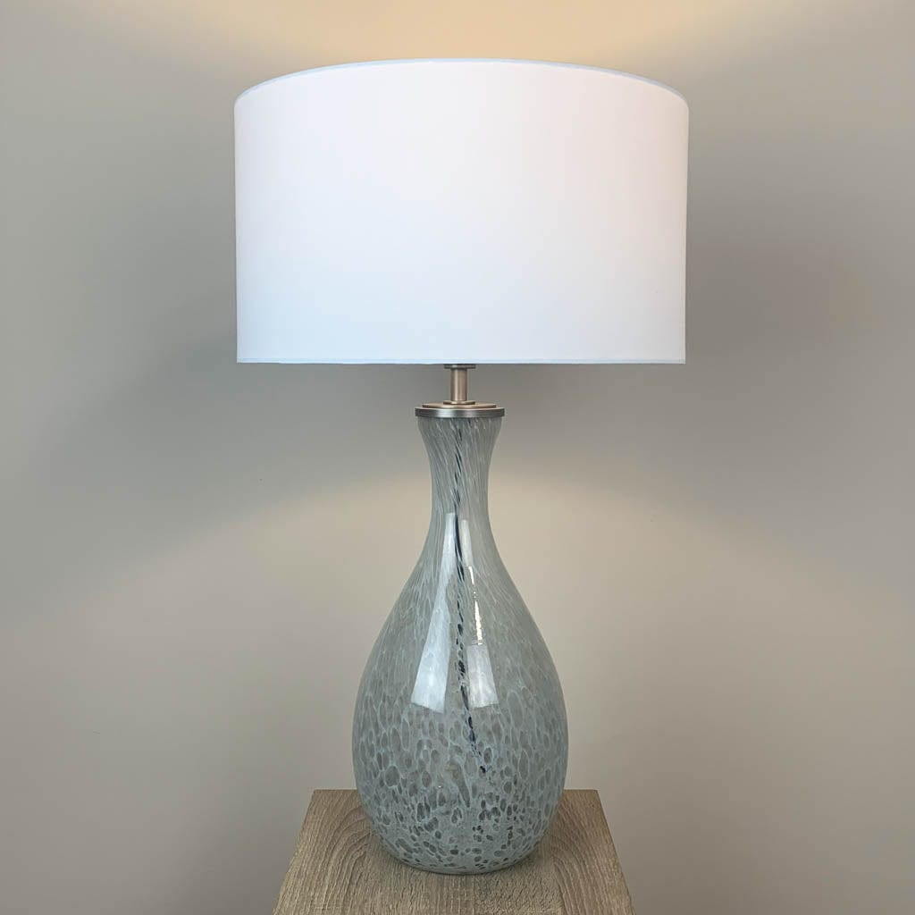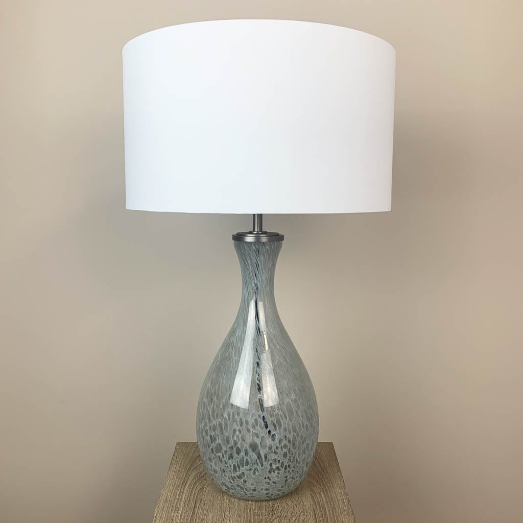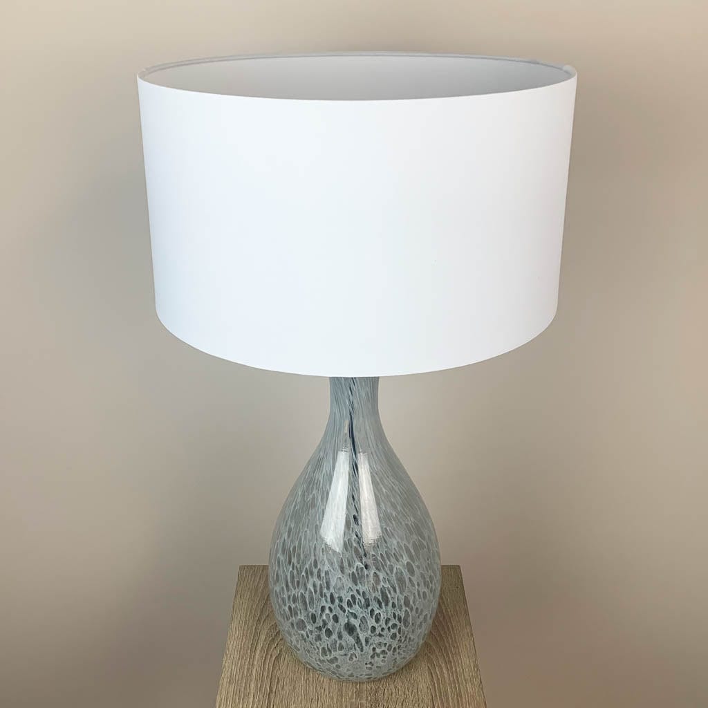 This simple and effective white cotton shallow drum lampshade perfectly complements the artisanal glass lamp base. Perfect for a white neutral interior and would work beautifully as a serene pair of bedside lamps.