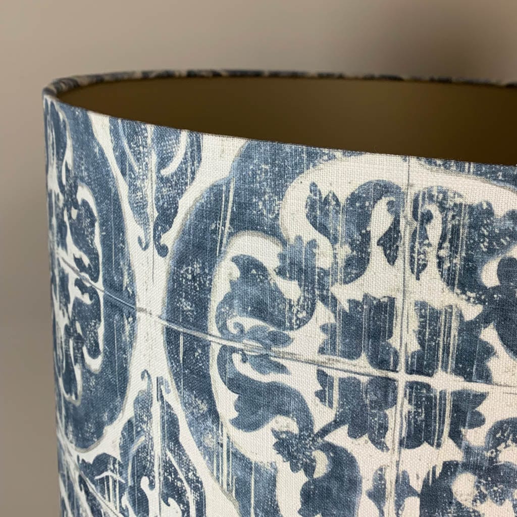 This gorgeous linen feel fabric in a tranquil blue & cream decorative tile design creates the perfect bespoke lampshade for this rustic, dark grey mango wood floor lamp. Lined with our champagne backing, this statement combo is the perfect addition for your home.