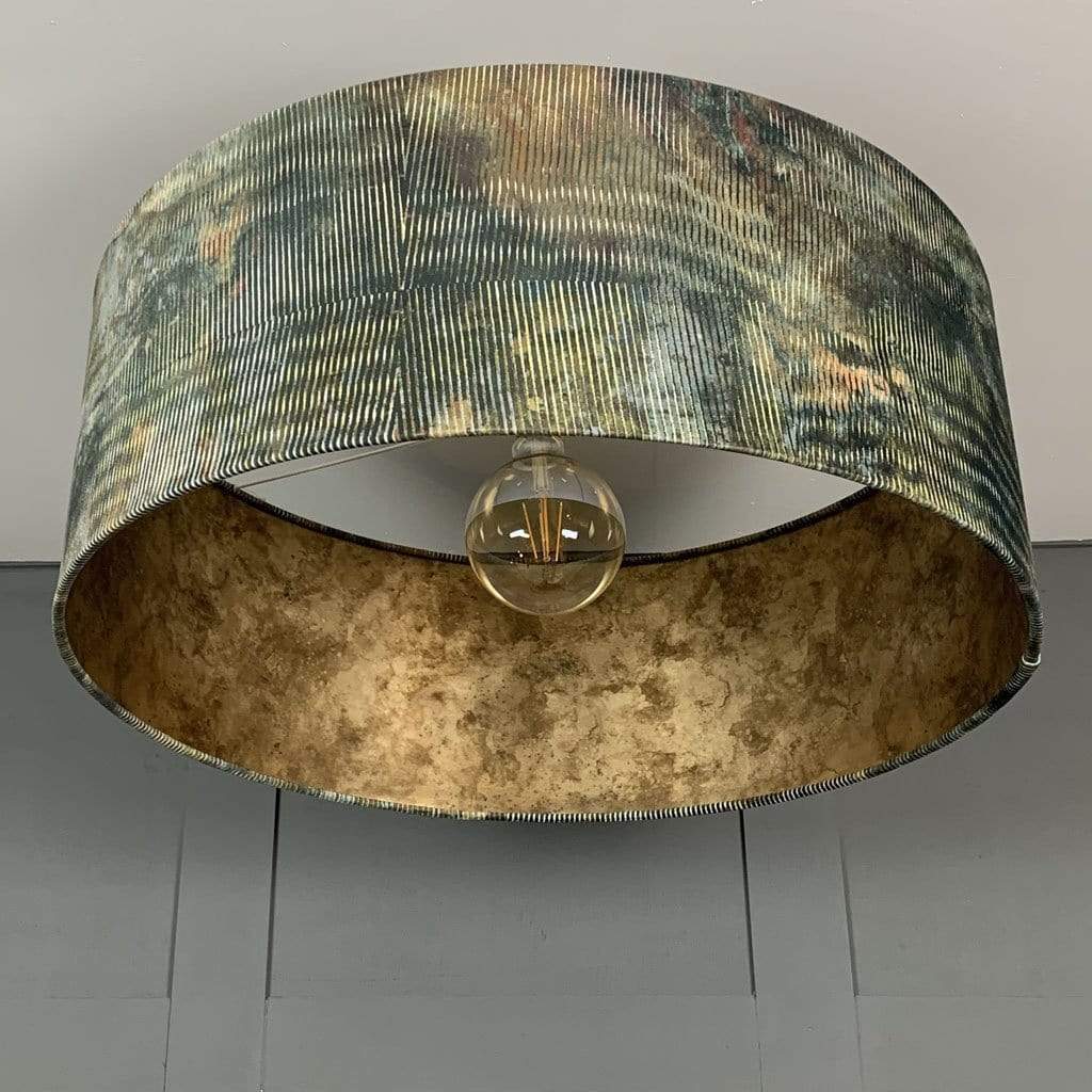 Here you see our Rocke Bespoke Iguana Electrified Pendant Shade. This beautiful multi tonal, painterly fabric is soft and luxurious to the touch and the perfect addition of earthly colours. Great way if you have a green scheme in your room and looking to add a slight pattern or touches of orange. Paired with a Burnished Golden Wallpaper which reflects a warm golden glow throughout your room.