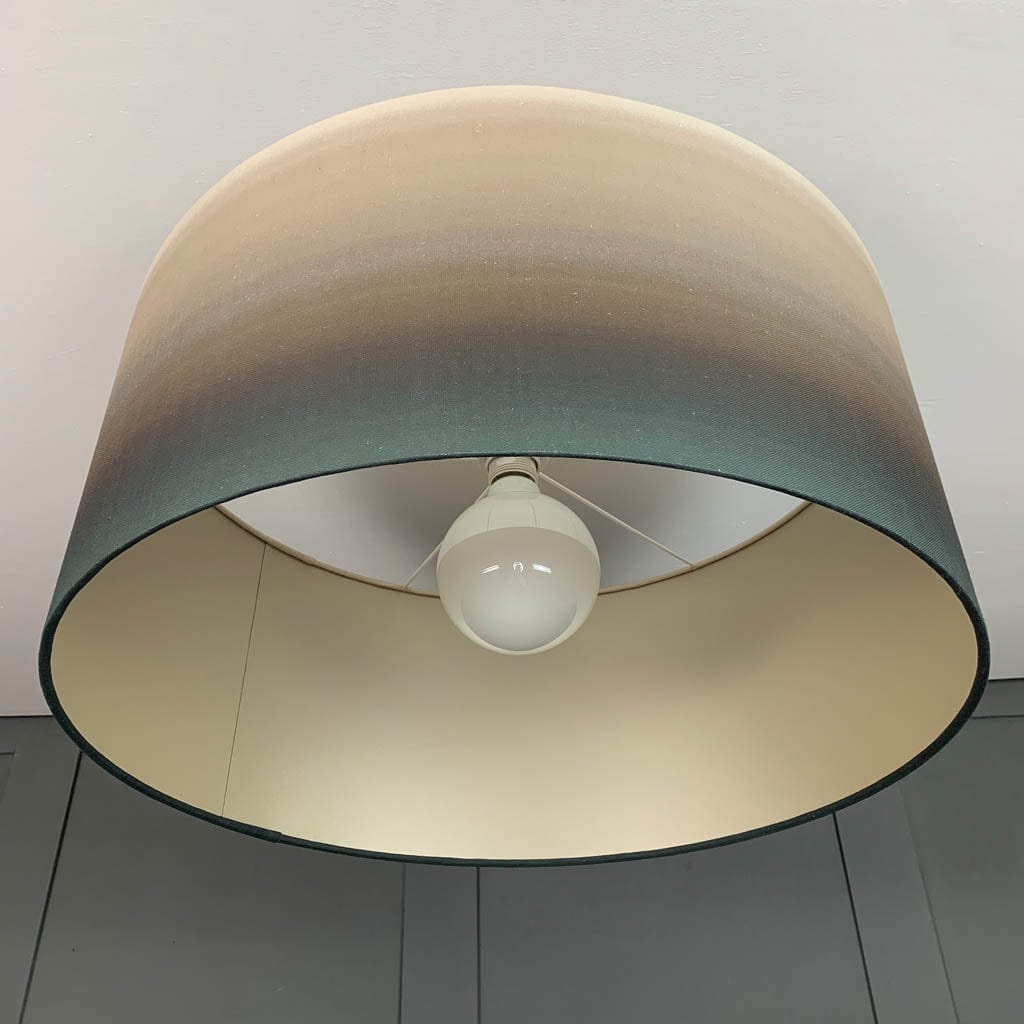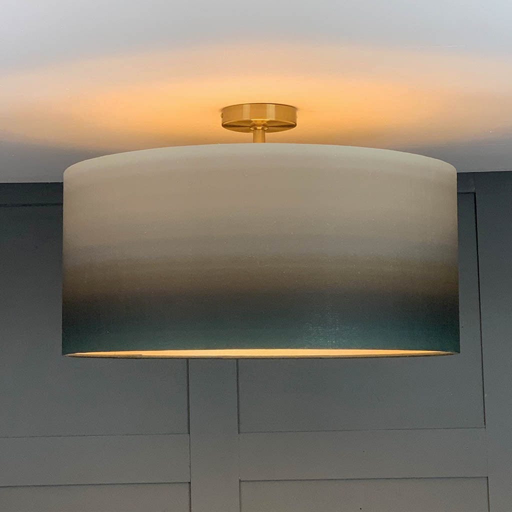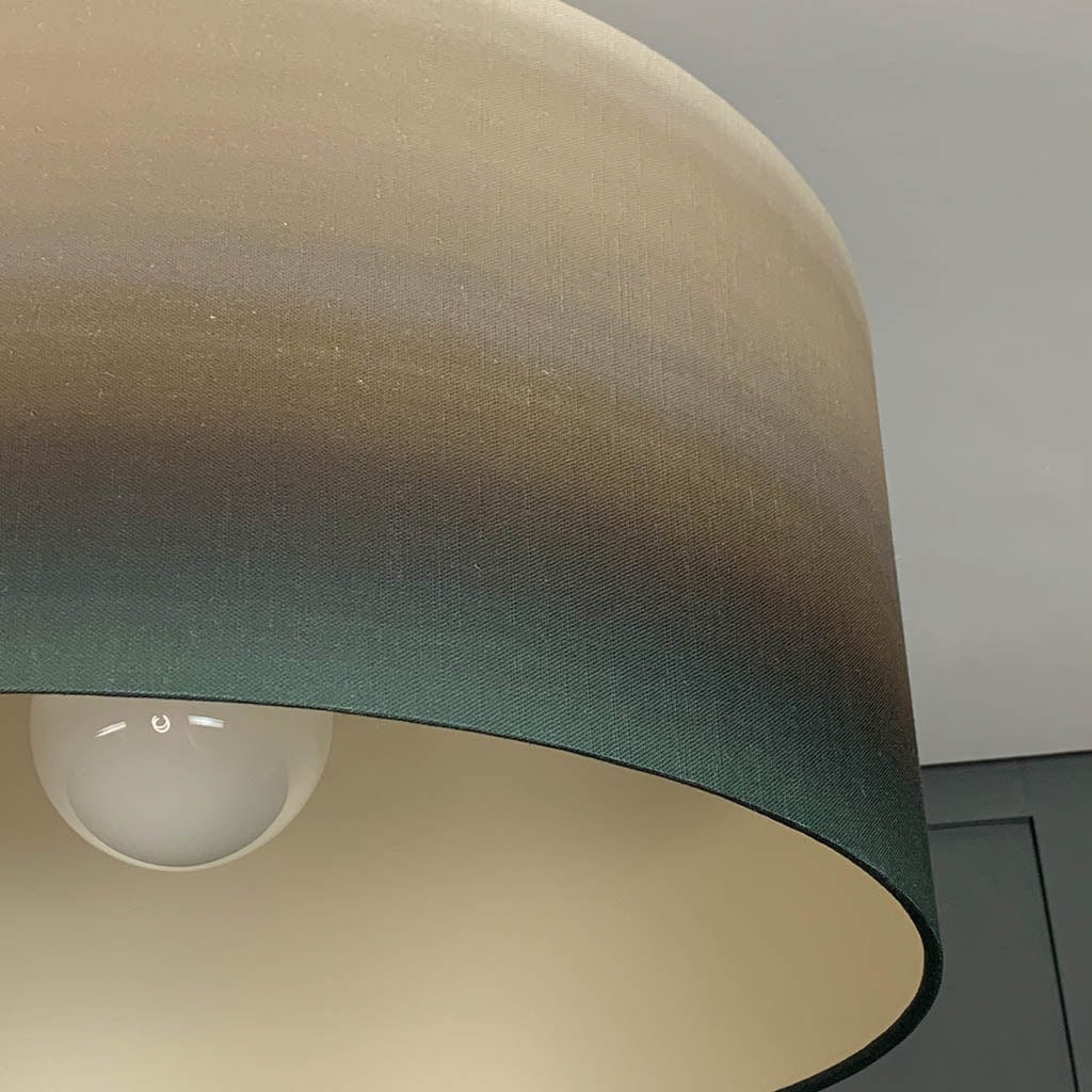 Layers of soothing colour from dark umber, to maroon, teal and emerald green merge and settle into a dark sea floor which envelope the interior space in richness and warmth. A hand painted Ombre design created by Julia Clare at a bespoke scale, perfect for our shallow ceiling shades. The soft tones in this printed linen are complemented by our choice of Champagne coloured lining.