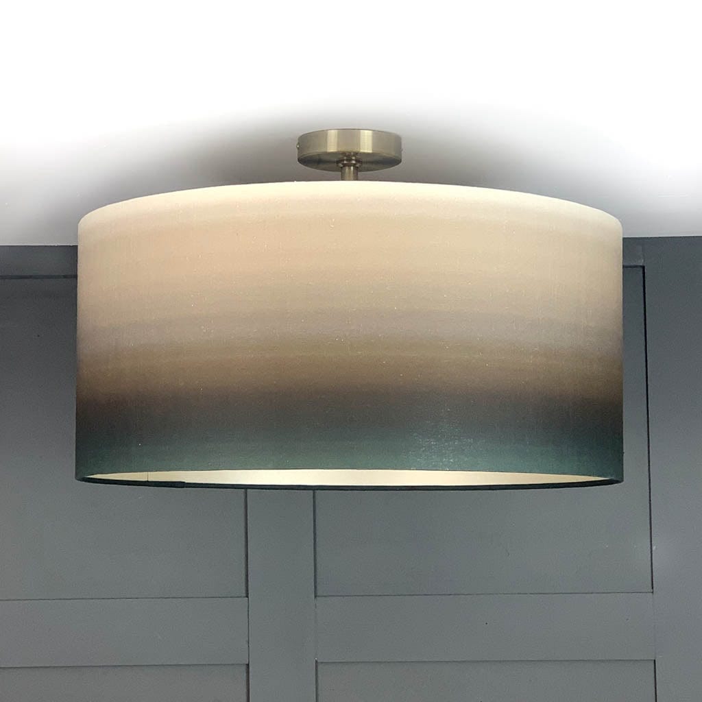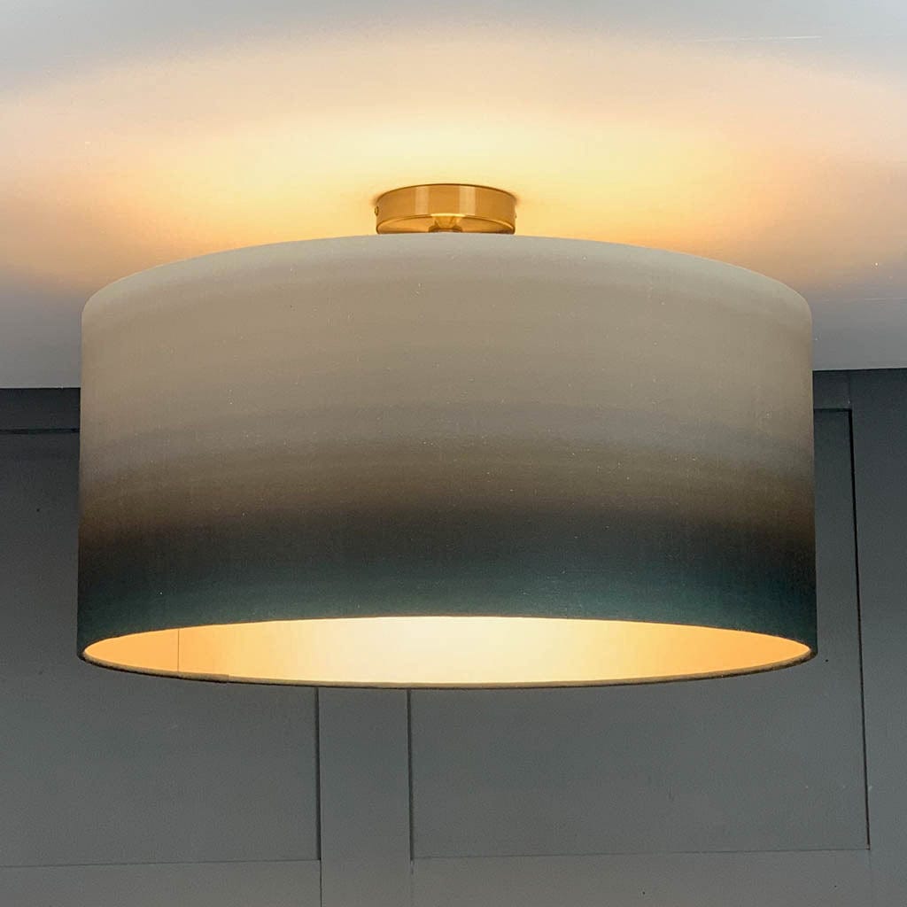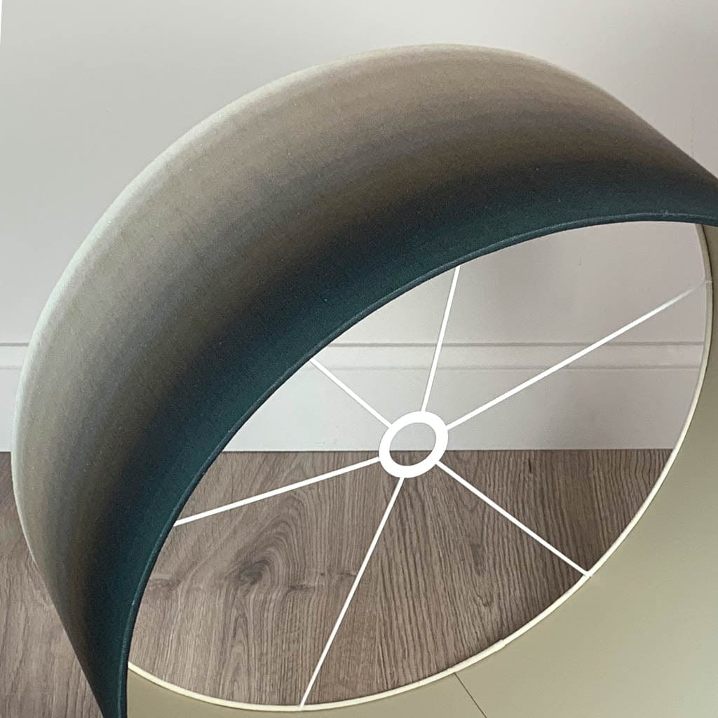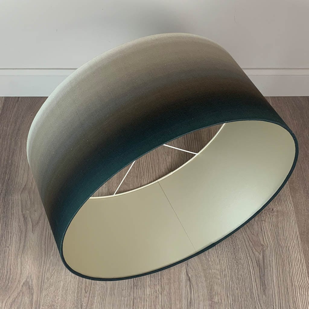Layers of soothing colour from dark umber, to maroon, teal and emerald green merge and settle into a dark sea floor which envelope the interior space in richness and warmth. A hand painted Ombre design created by Julia Clare at a bespoke scale, perfect for our shallow ceiling shades. The soft tones in this printed linen are complemented by our choice of Champagne coloured lining.