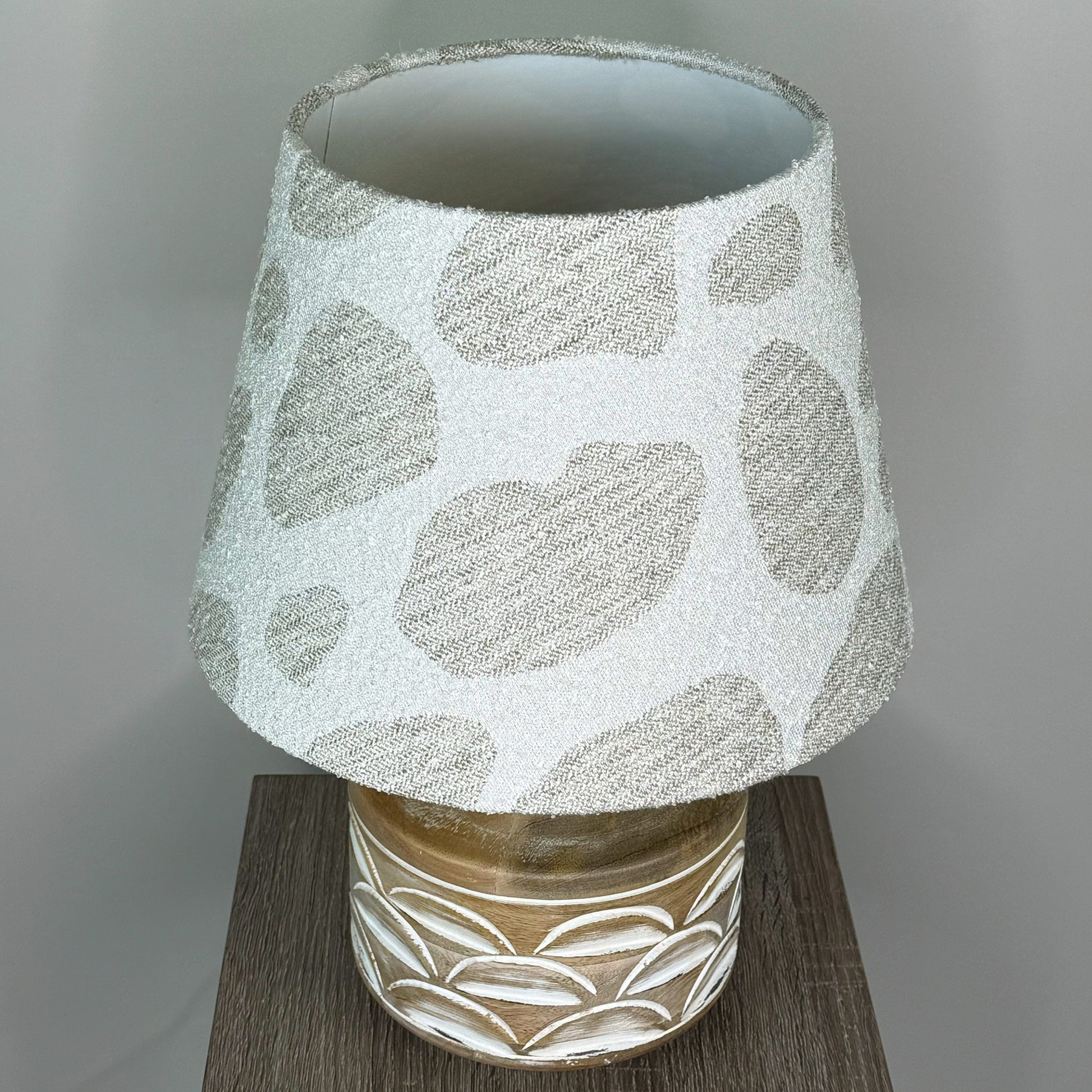 Kingsbury Small White Wash Carved Table Lamp with Bodie Ecru Boucle Tapered Shade