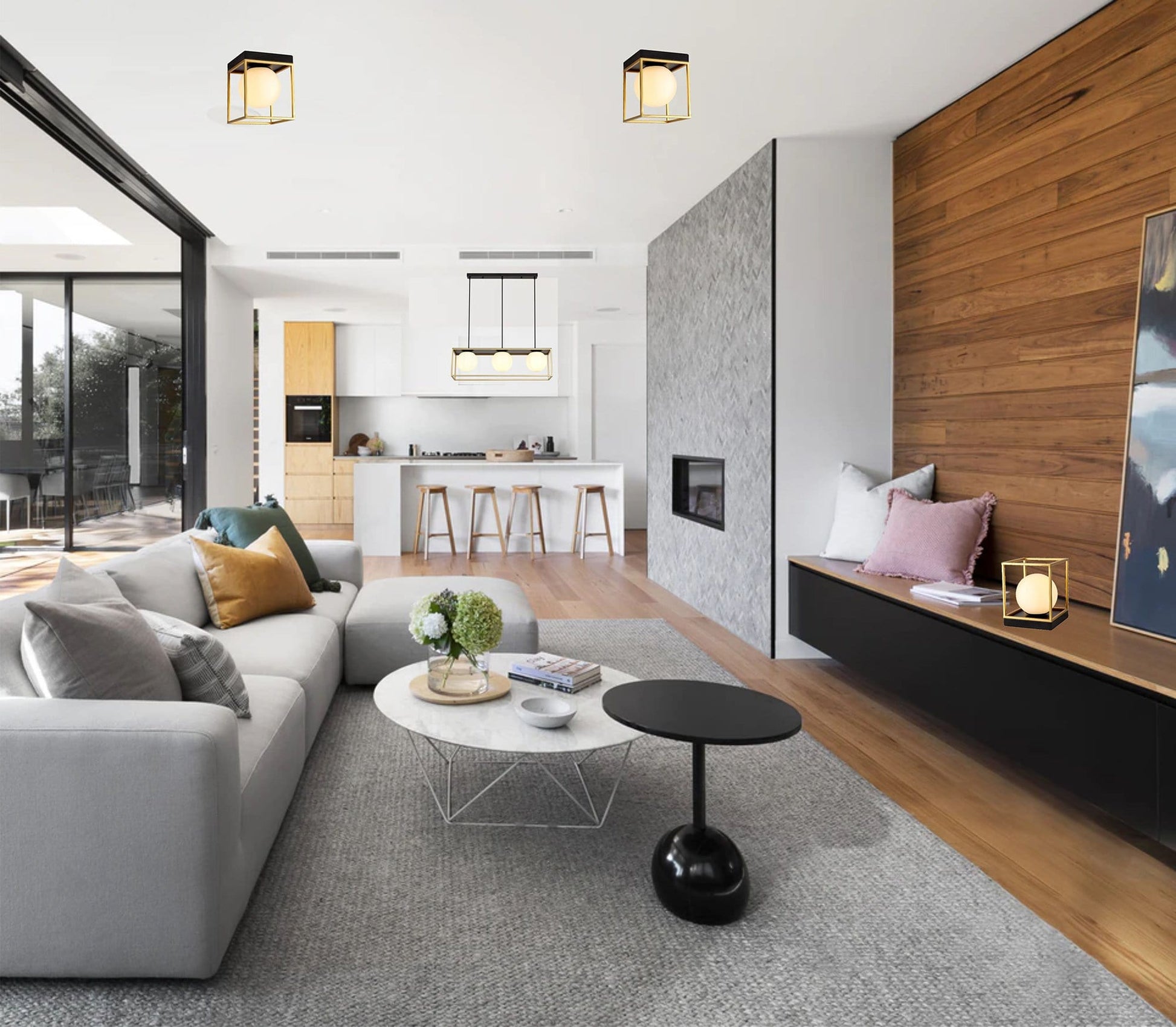 The clean square shapes of this comprehensive range Loft, emit a slightly art deco feel. The painted gold frame perfectly offset against the matt black plates outlines the E14 lampholders to form an open faced cube shape, producing an ambient source of light in a stylish, fashionable feature.