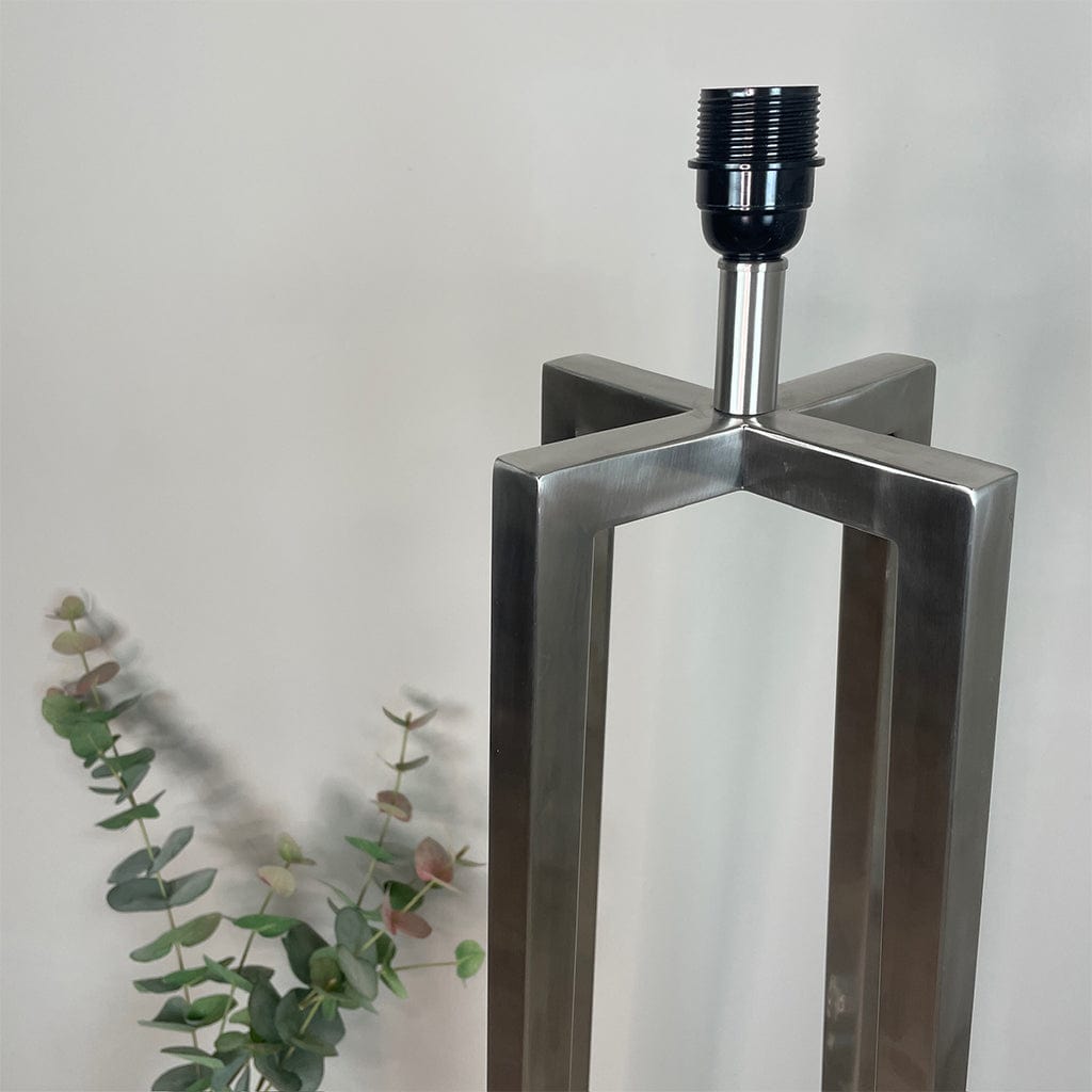 Here we have the Madison Floor Lamp in our Brushed Steel Finish. It features two tall angled interconnecting tapered rectangles. Giving a retro masculine vibe, a popular choice here at Cotterell & Co. Take a closer look and you will actually see the little brush strokes up the base of the lamp.
