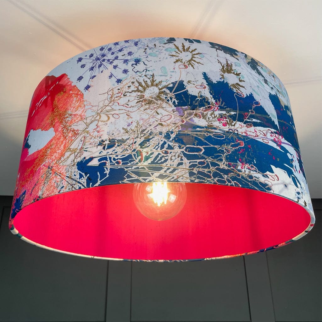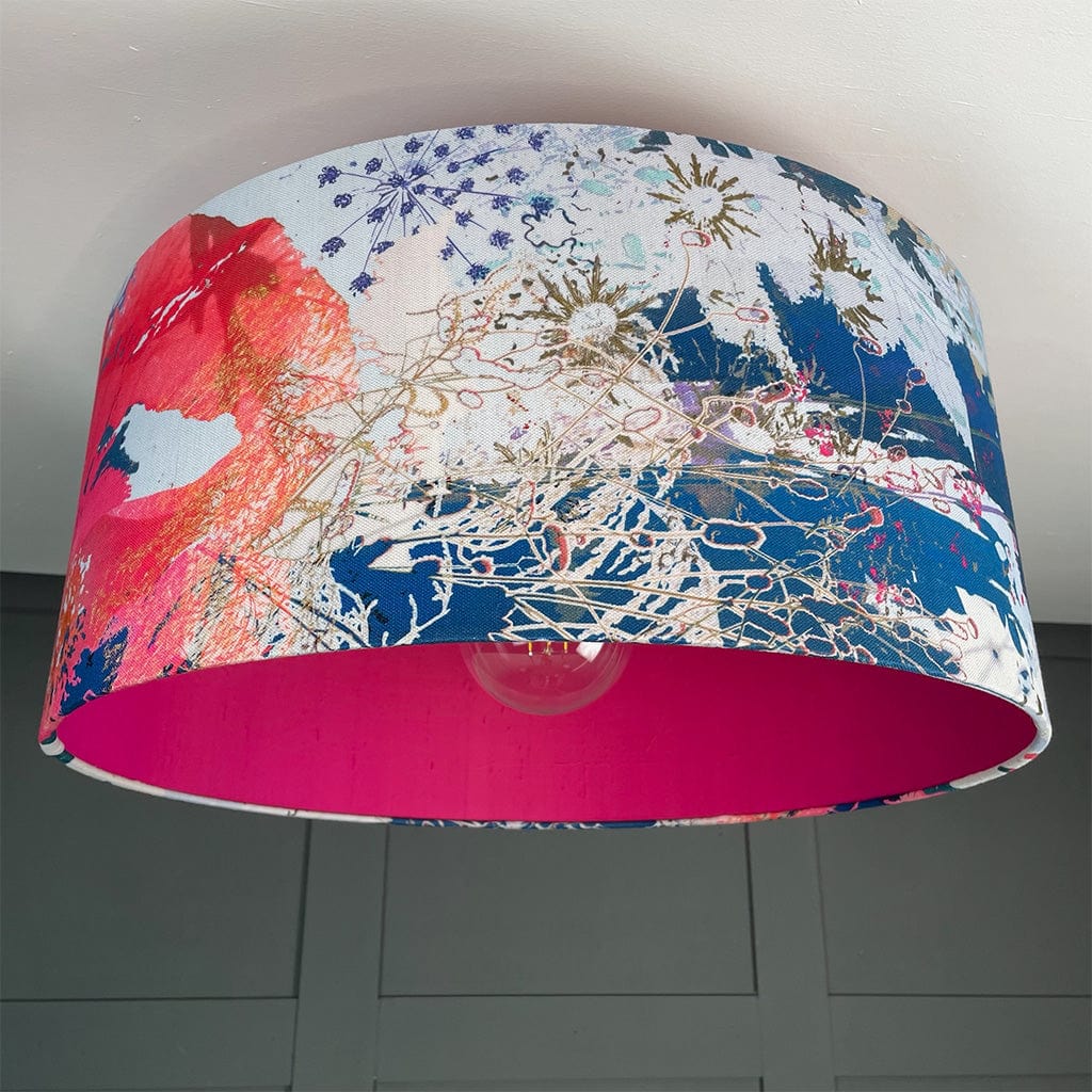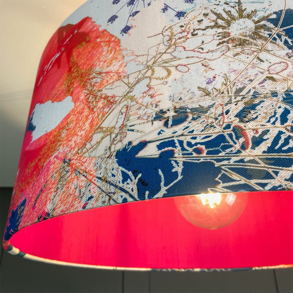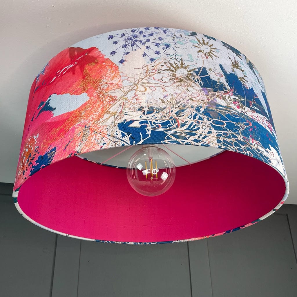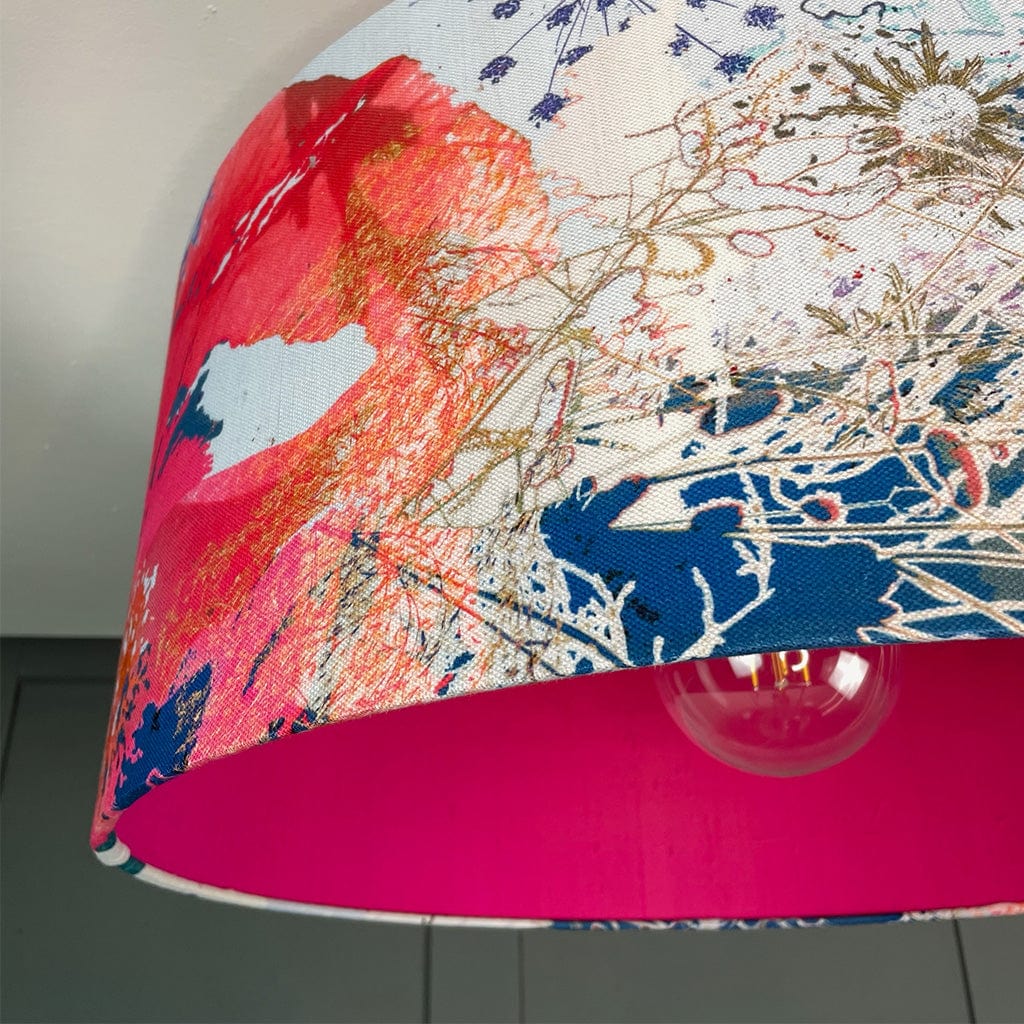 Set a colourful mood in any room with this lampshade pendant, made with Mairi Helena's Poppy Cloud linen. The design captures the beauty of a summer meadow, with a vibrant red and coral poppy design against a striking blue sky and delicate petals framed by floaty clouds. The fabric’s detailed seed and grass heads offer a hint of the coastal gardens of Wester Ross. The exterior is toned by a bright lipstick pink real silk to invoke the warmth of the summer sun.
