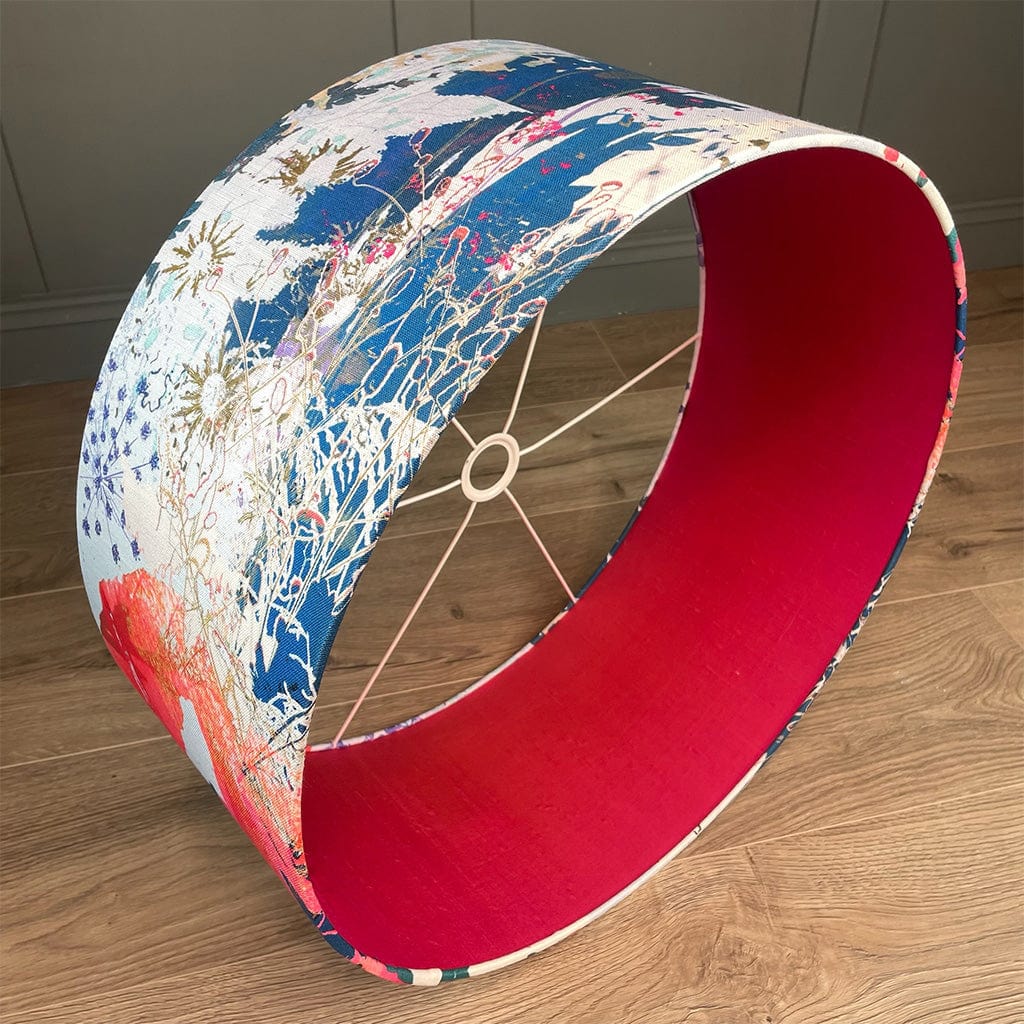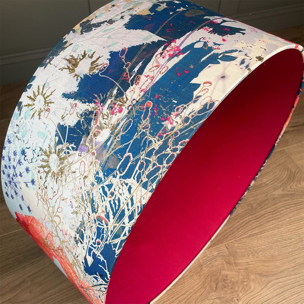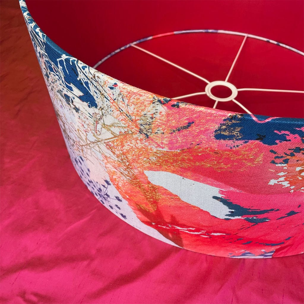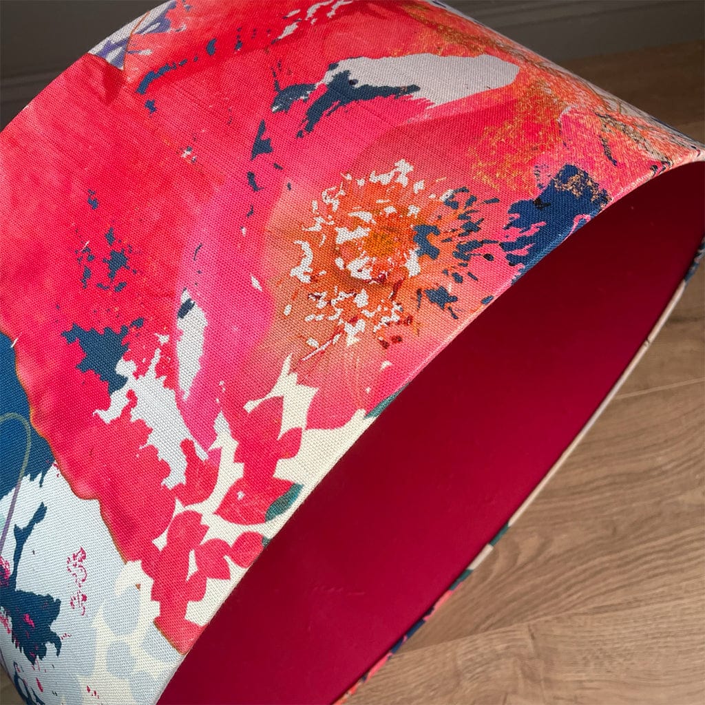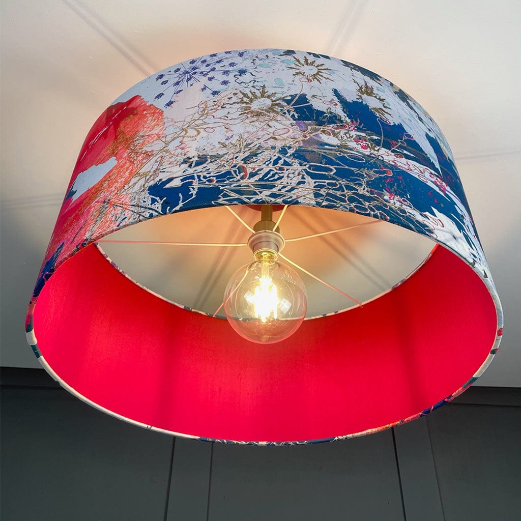 Set a colourful mood in any room with this lampshade pendant, made with Mairi Helena's Poppy Cloud linen. The design captures the beauty of a summer meadow, with a vibrant red and coral poppy design against a striking blue sky and delicate petals framed by floaty clouds. The fabric’s detailed seed and grass heads offer a hint of the coastal gardens of Wester Ross. The exterior is toned by a bright lipstick pink real silk to invoke the warmth of the summer sun.