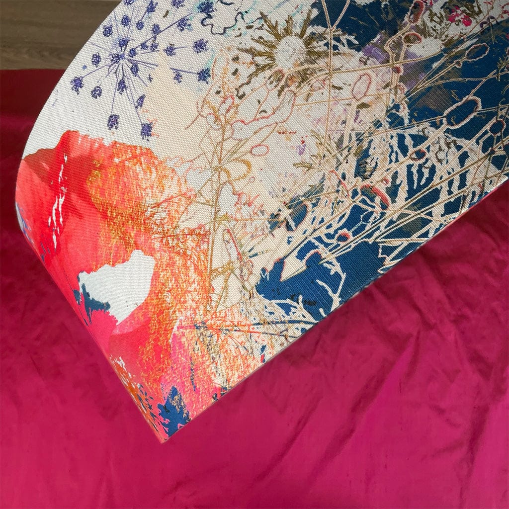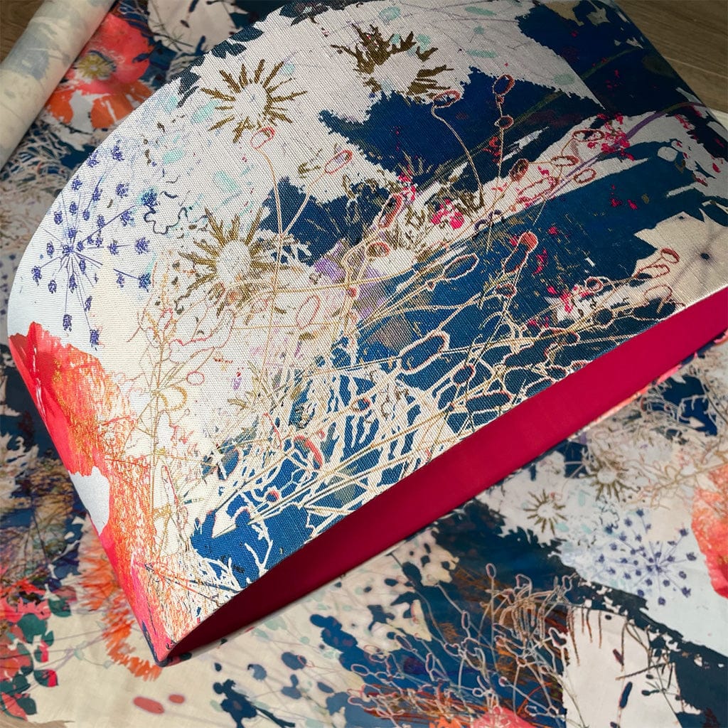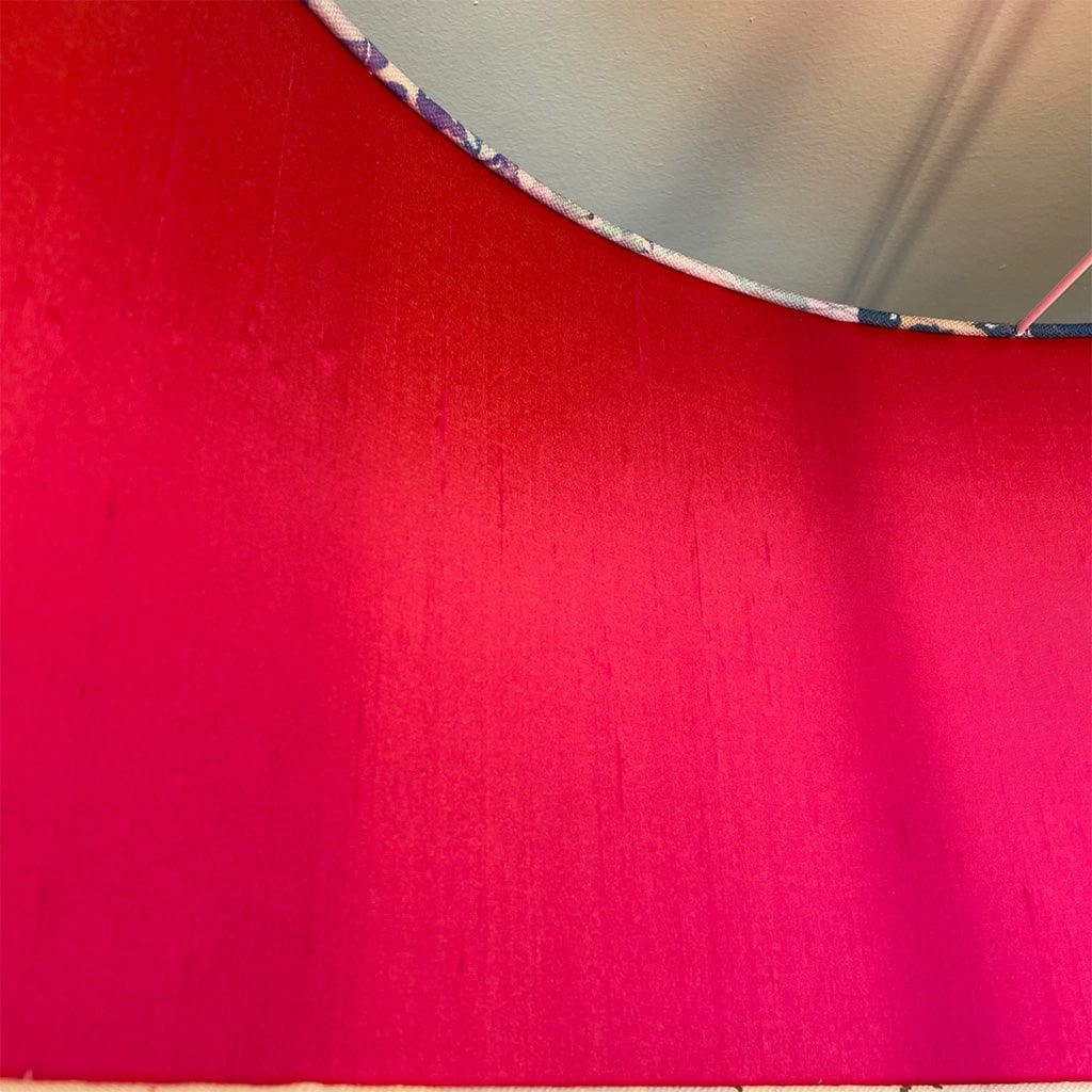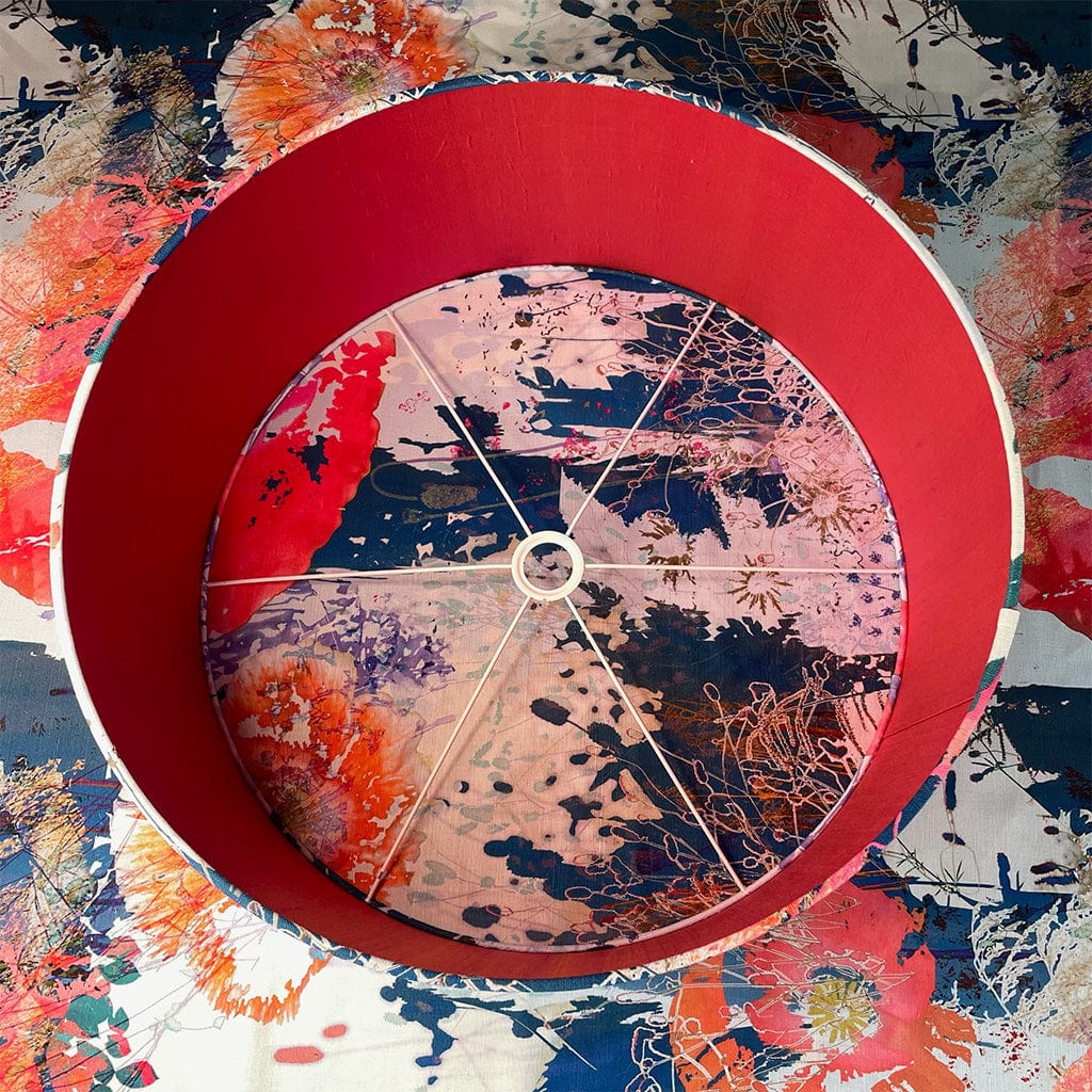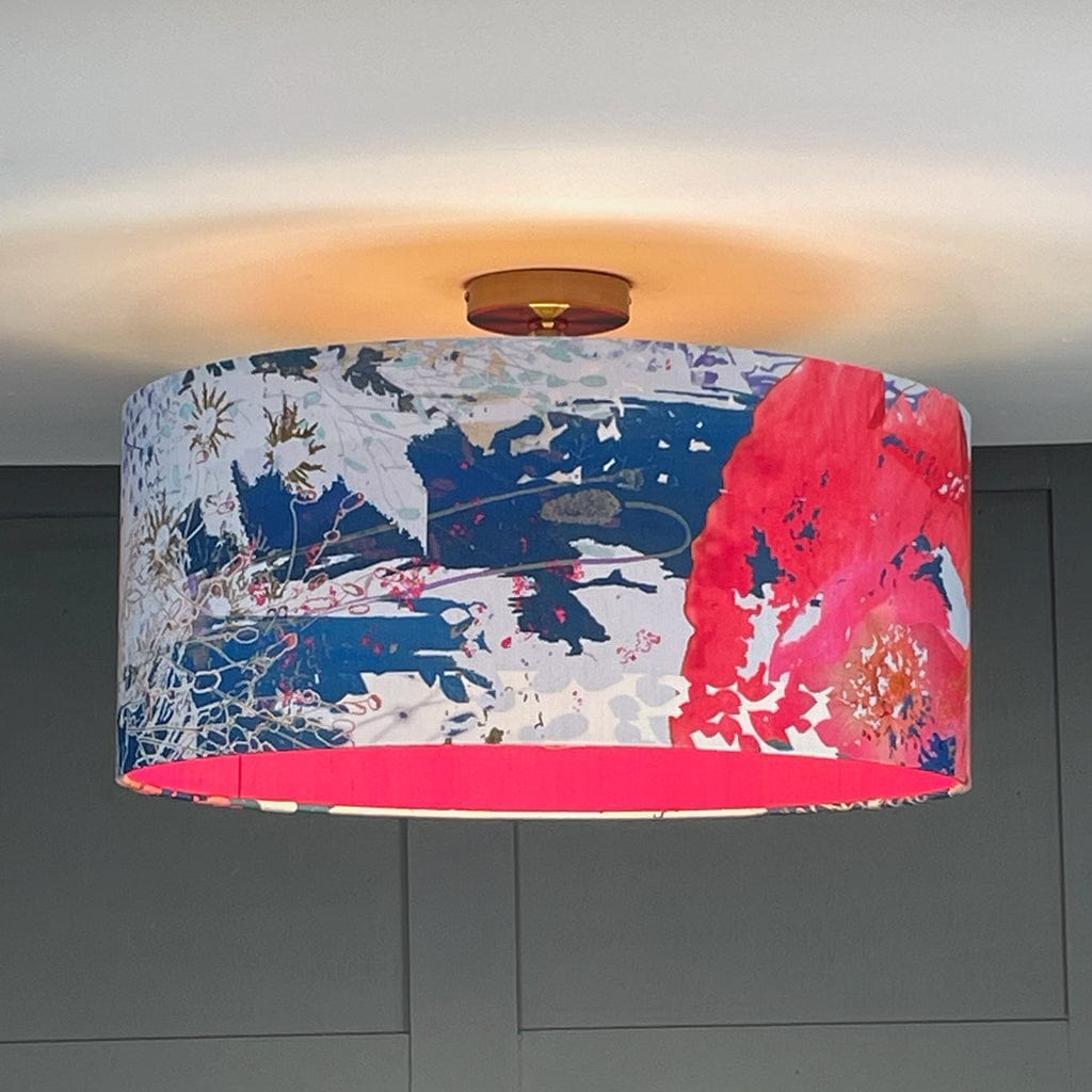 Set a colourful mood in any room with this lampshade pendant, made with Mairi Helena's Poppy Cloud linen. The design captures the beauty of a summer meadow, with a vibrant red and coral poppy design against a striking blue sky and delicate petals framed by floaty clouds. The fabric’s detailed seed and grass heads offer a hint of the coastal gardens of Wester Ross. The exterior is toned by a bright lipstick pink real silk to invoke the warmth of the summer sun.