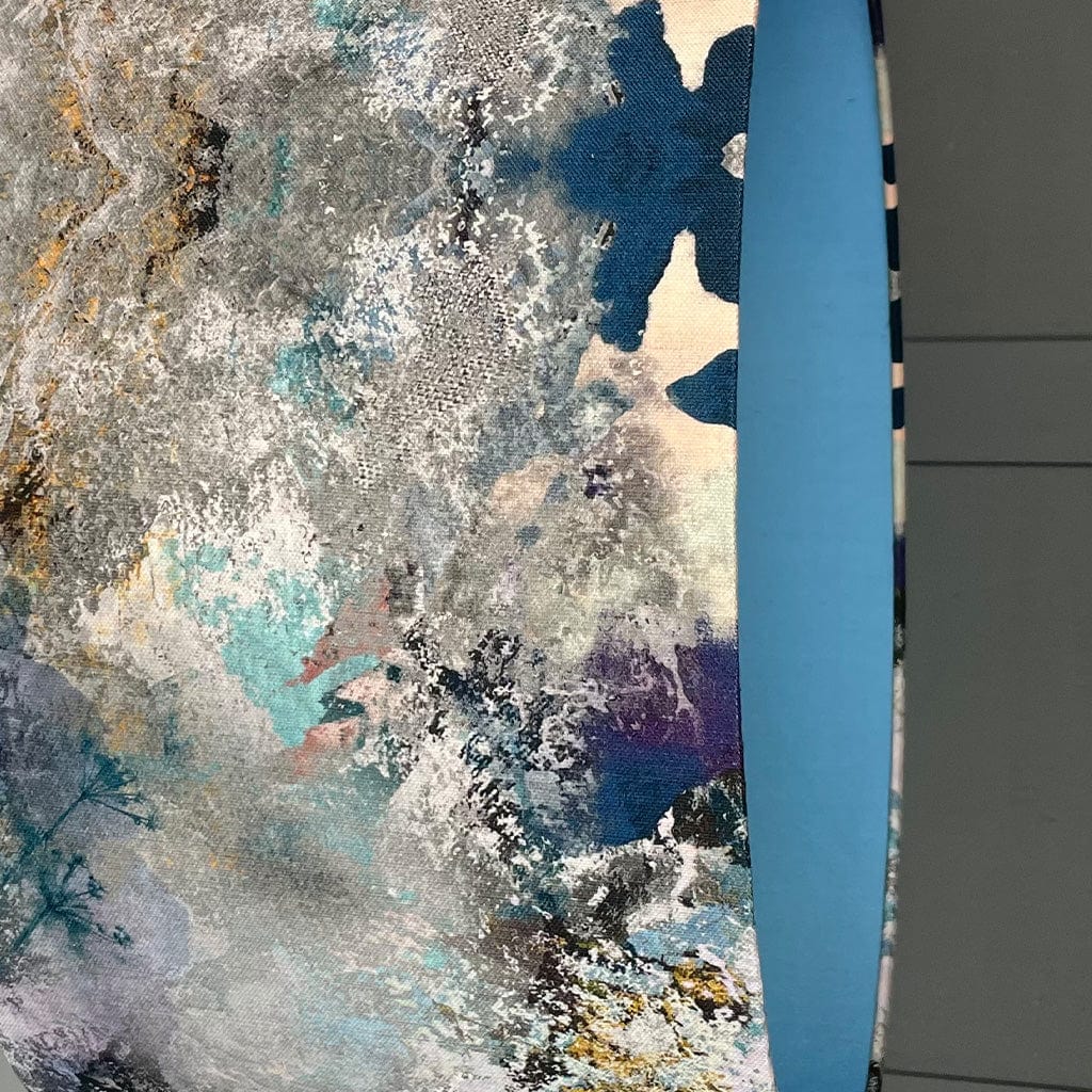 We just love the abstracted landscape designs of the Scottish designer maker Maire Helena. Here we have used the fresh feels of Hebridean Homeland linen on the exterior of this ceiling lampshade. The inspiration for this design is the rugged coastline of the Hebridean archipelago. Blues, turquoise, lilac and ochre reflect the myriad of coastal colours. We have picked out a bold blue faux silk for the lining of this shade, tying in with the seaside tones throughout.