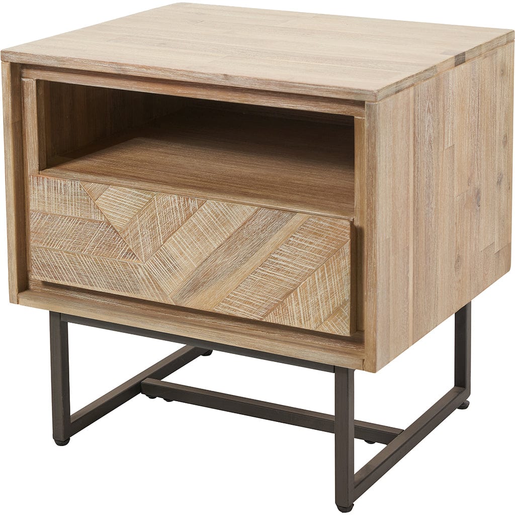 This bedside unit boasts a single drawer and open niche, offering generous storage. With its distinctive textured wood-panelled finish and sleek metal legs, this Scandi-inspired piece adds function and style to your bedroom.