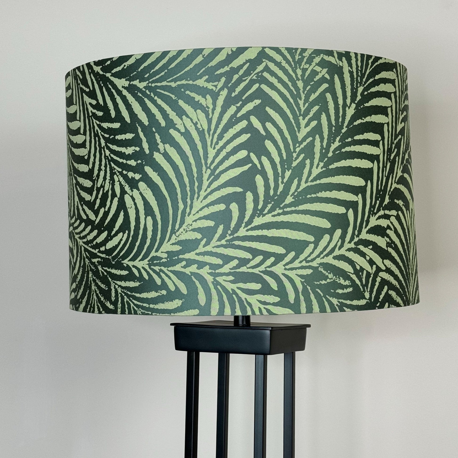 This standard lamp is striking in size and style, paired here with a handcrafted shade form our Rocke Bespoke design studio. This standard lamp adds a touch of class and modern minimalism to a traditional style. The shade in the fabric, Acoustic Palm Emerald complements the matt black style by adding a touch of exotic greens.