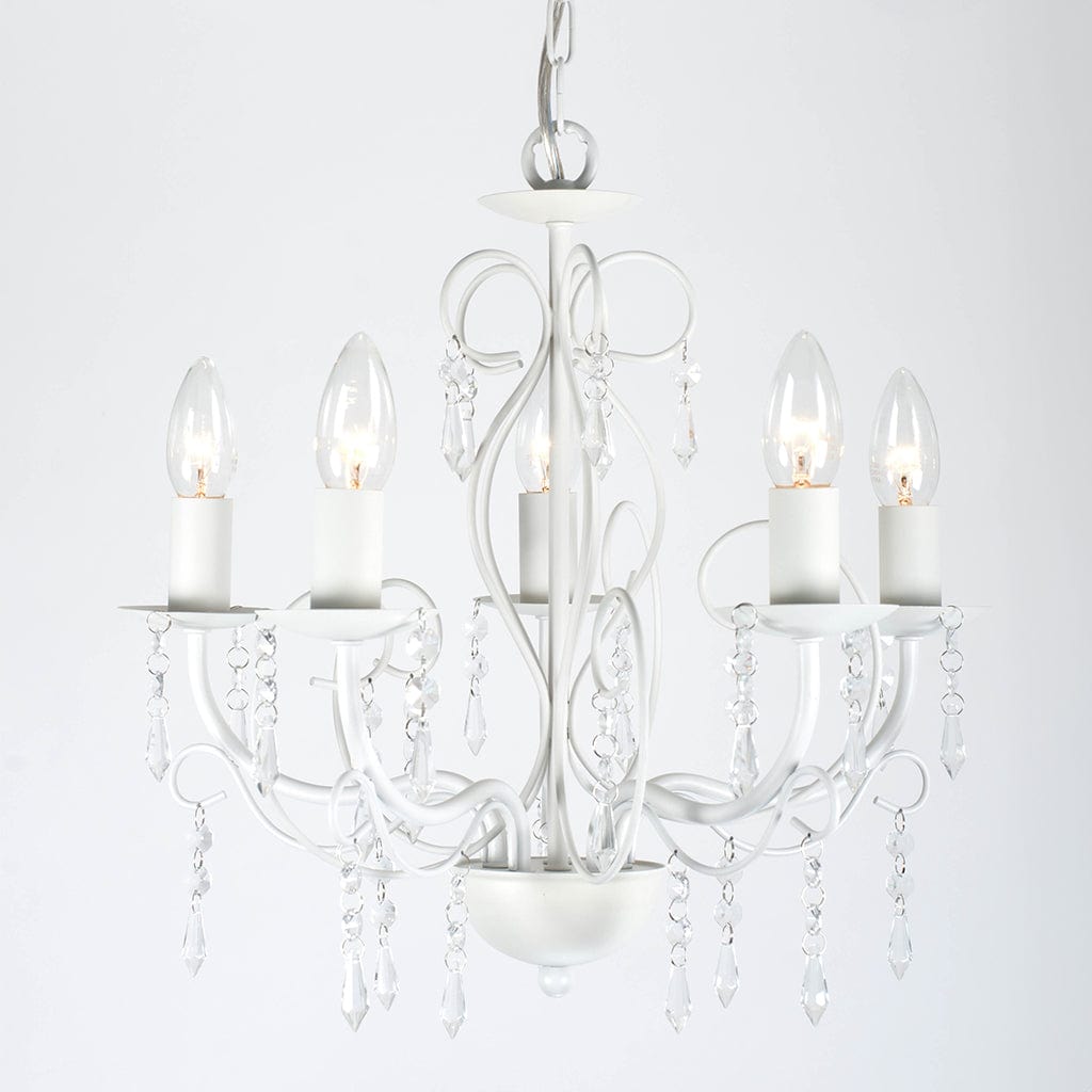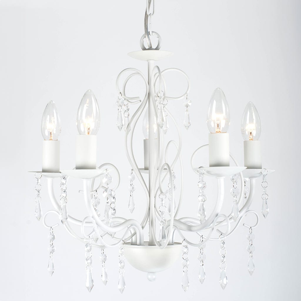 Adorable shabby chic, French style chandelier with glass drop crystals hanging from and intricate white painted metal frame.