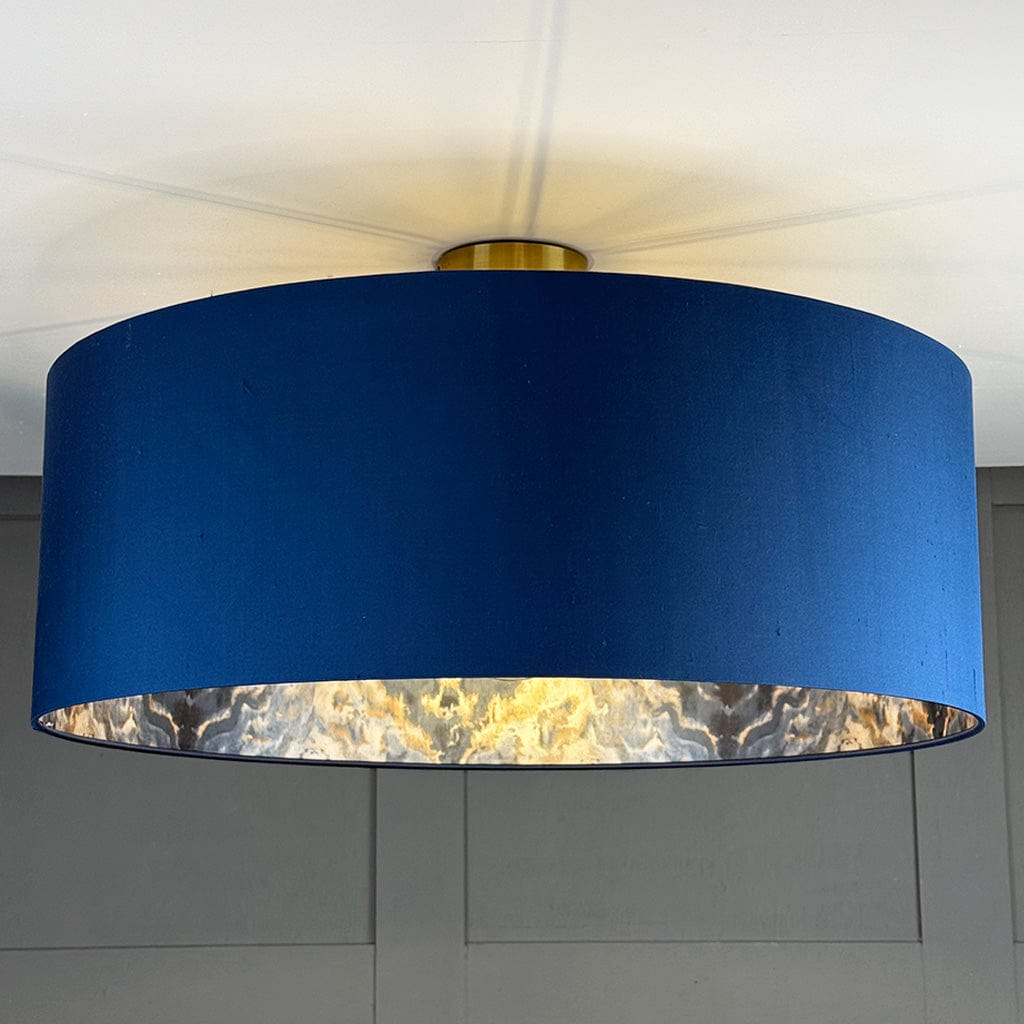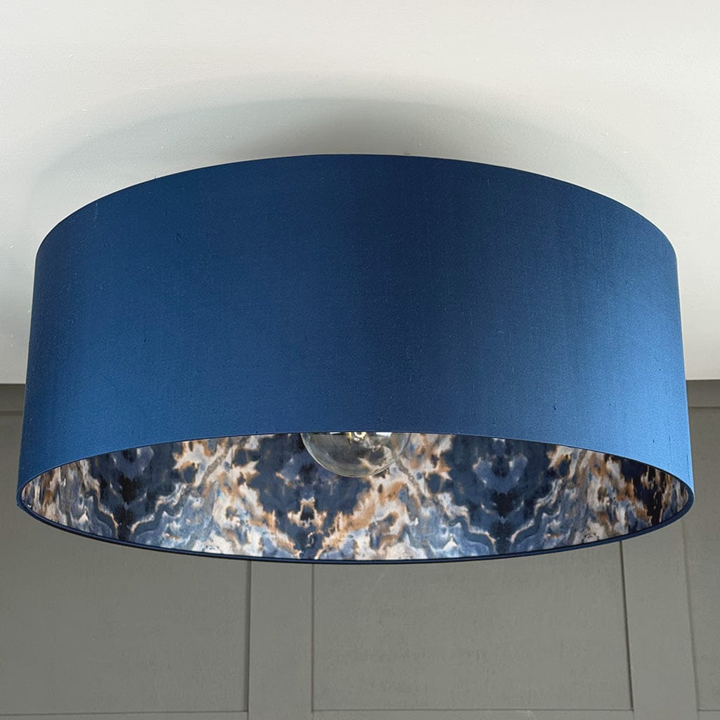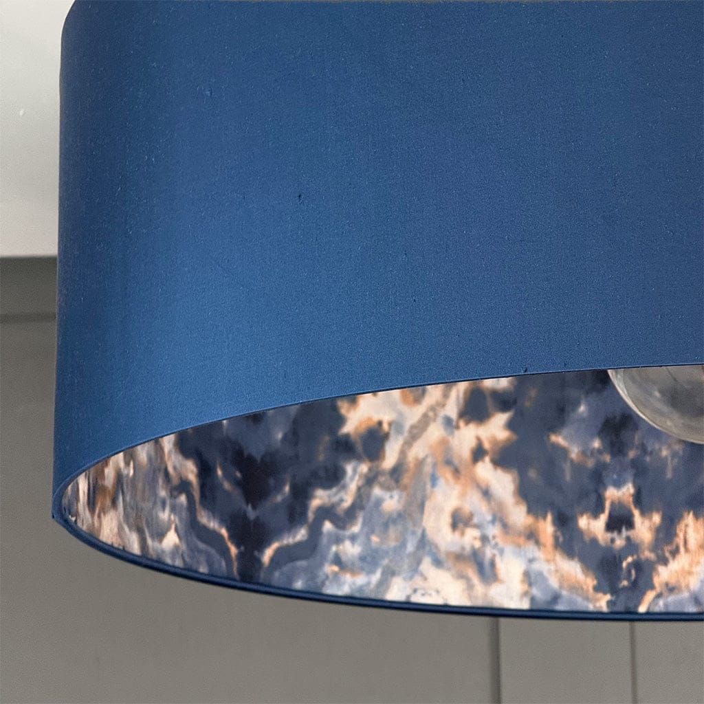 A deep navy silk exterior gives this drum shade a clean, confident look by day - the natural dragging and slubs in the real silk adding subtle texture and depth that flat fabric simply can't replicate. Switch it on and the Aqueous Midnight Spice wallpaper lining transforms, the marbled copper and bronze tones glowing like molten stone and bouncing warmth back through that tactile silk surface.