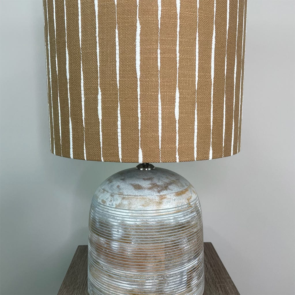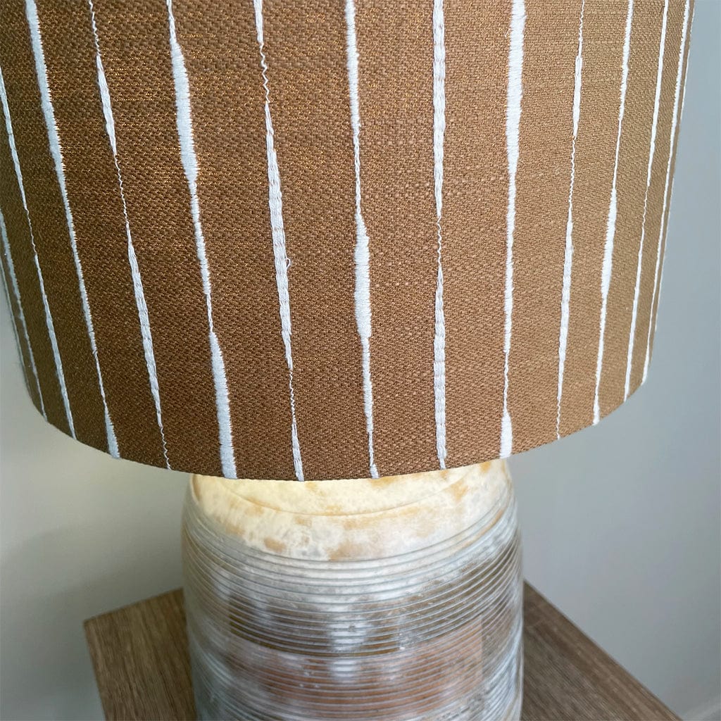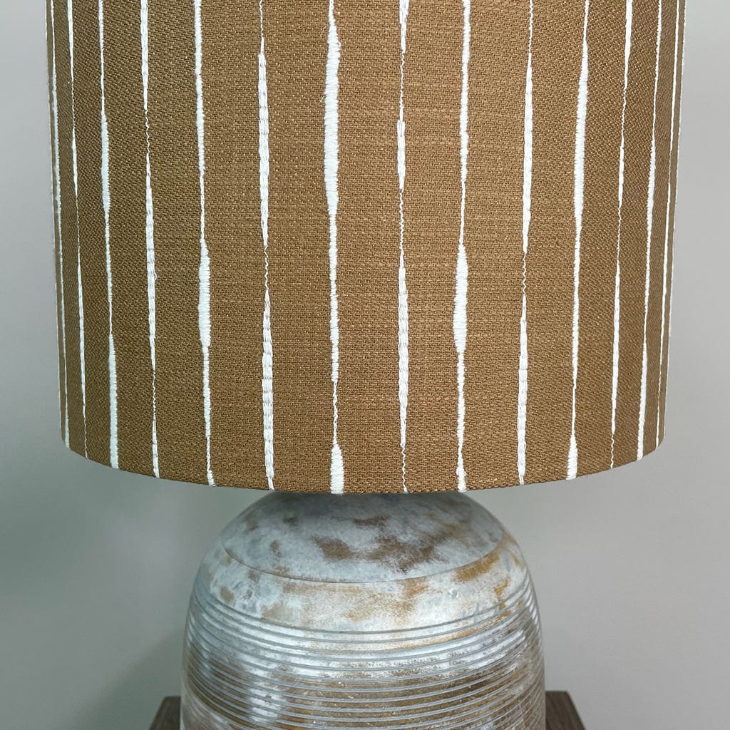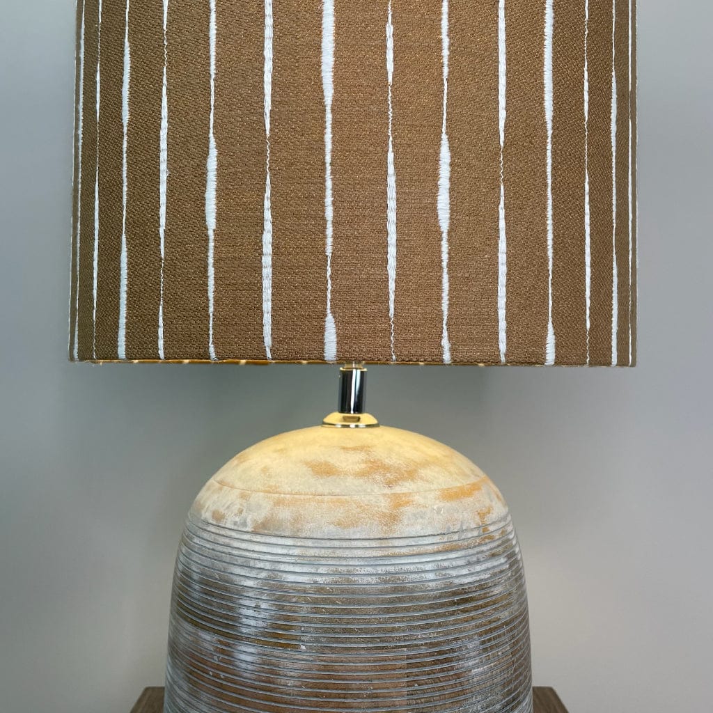 We have paired with this stylish dome-shaped mango wood table lamp which adds contemporary flair to any space. The warm grey wash and engraved stripe detail have been hand carved in India to create a unique look that will add character to any room. This lamp base is available in a warm wood and a black, please contact us for more information.