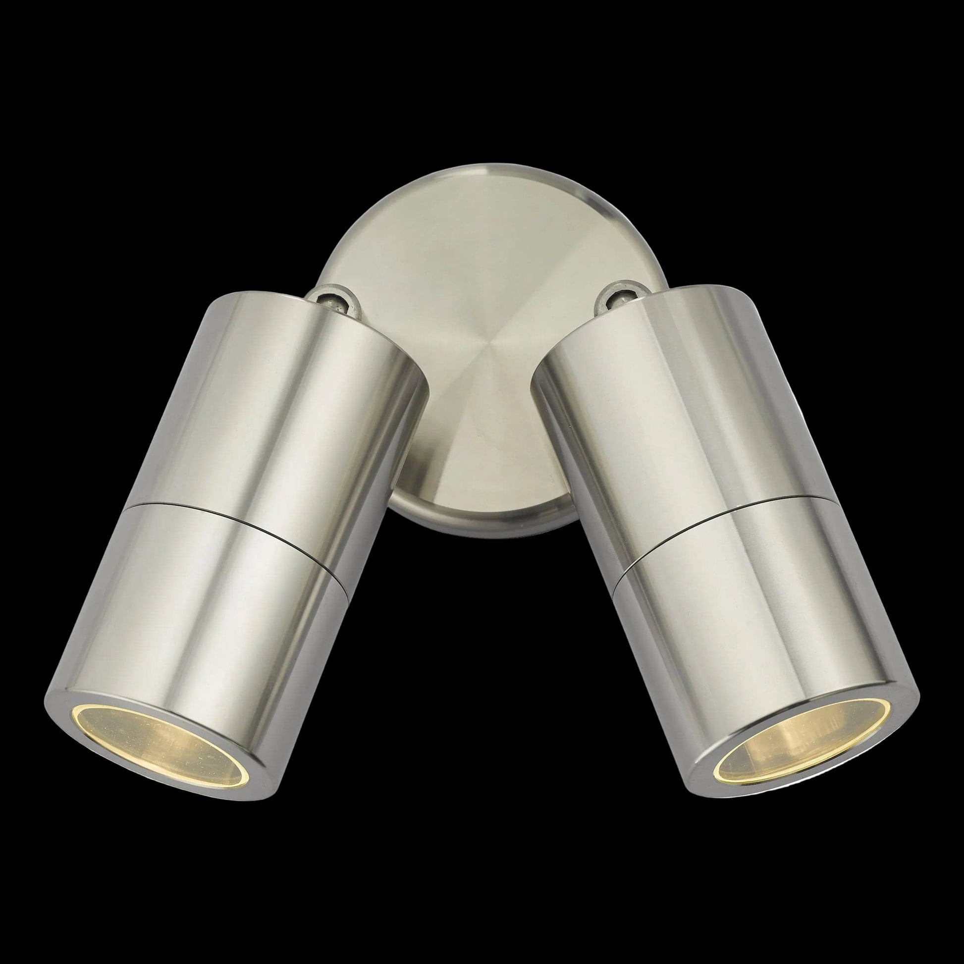 IP65-rated outdoor wall spotlight with dual lights. Not recommended for coastal areas or surfaces with corrosive materials like lime-based renders. Best suited for standard outdoor installations.