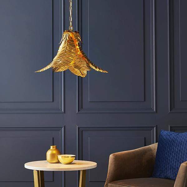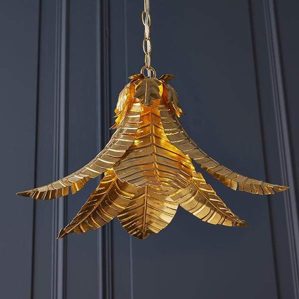 Palm is a modern luxe statement pendant that will inject a sense of fun and theatre into your décor. Expertly crafted overlapping palm leaves flare out around a central bulb. The light shines out through the leaves illuminating itself to create an ambient glow. This pendant would shine against a dark painted backdrop. For quirky kitchen lights hang three over an island or dining table.