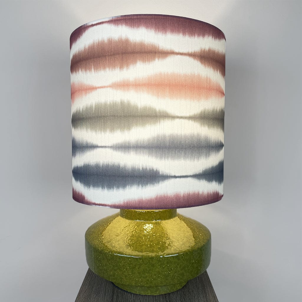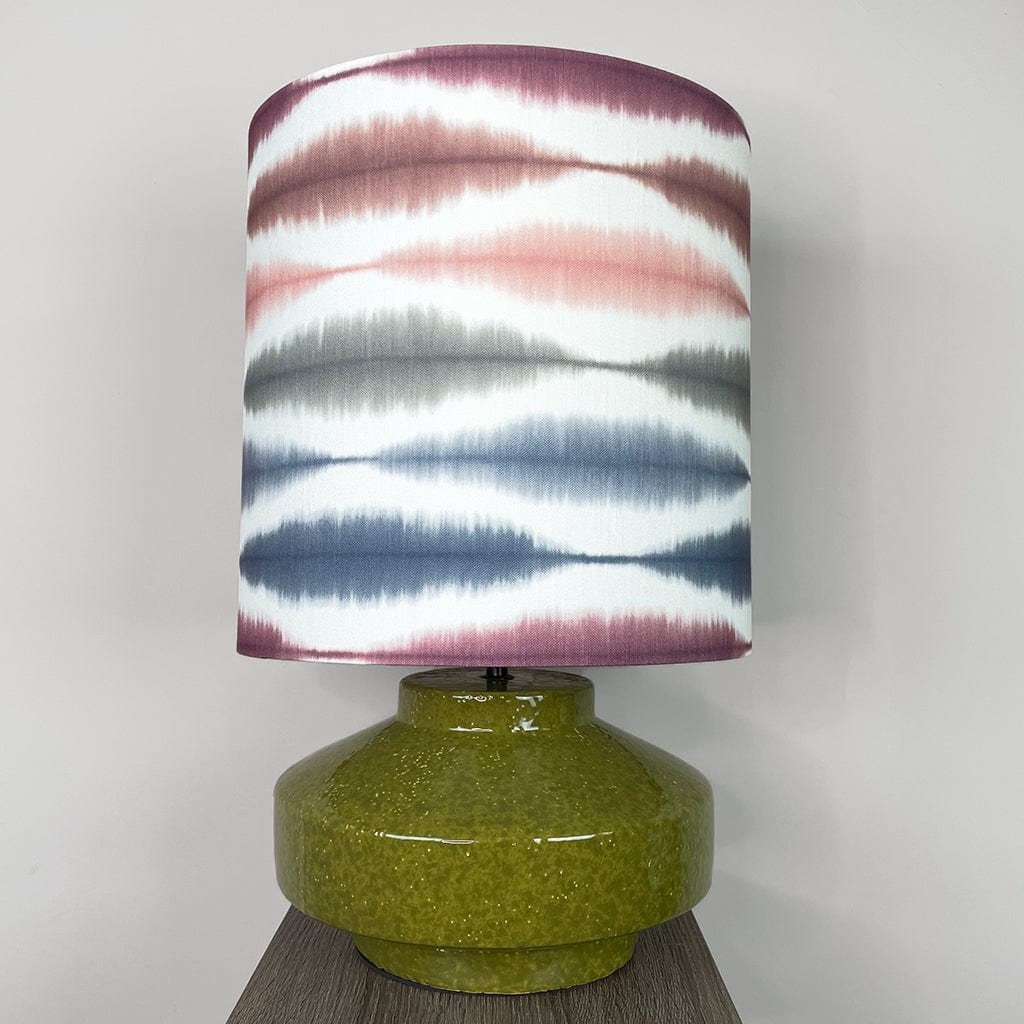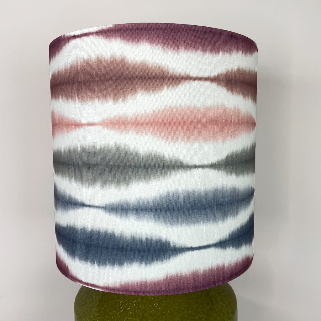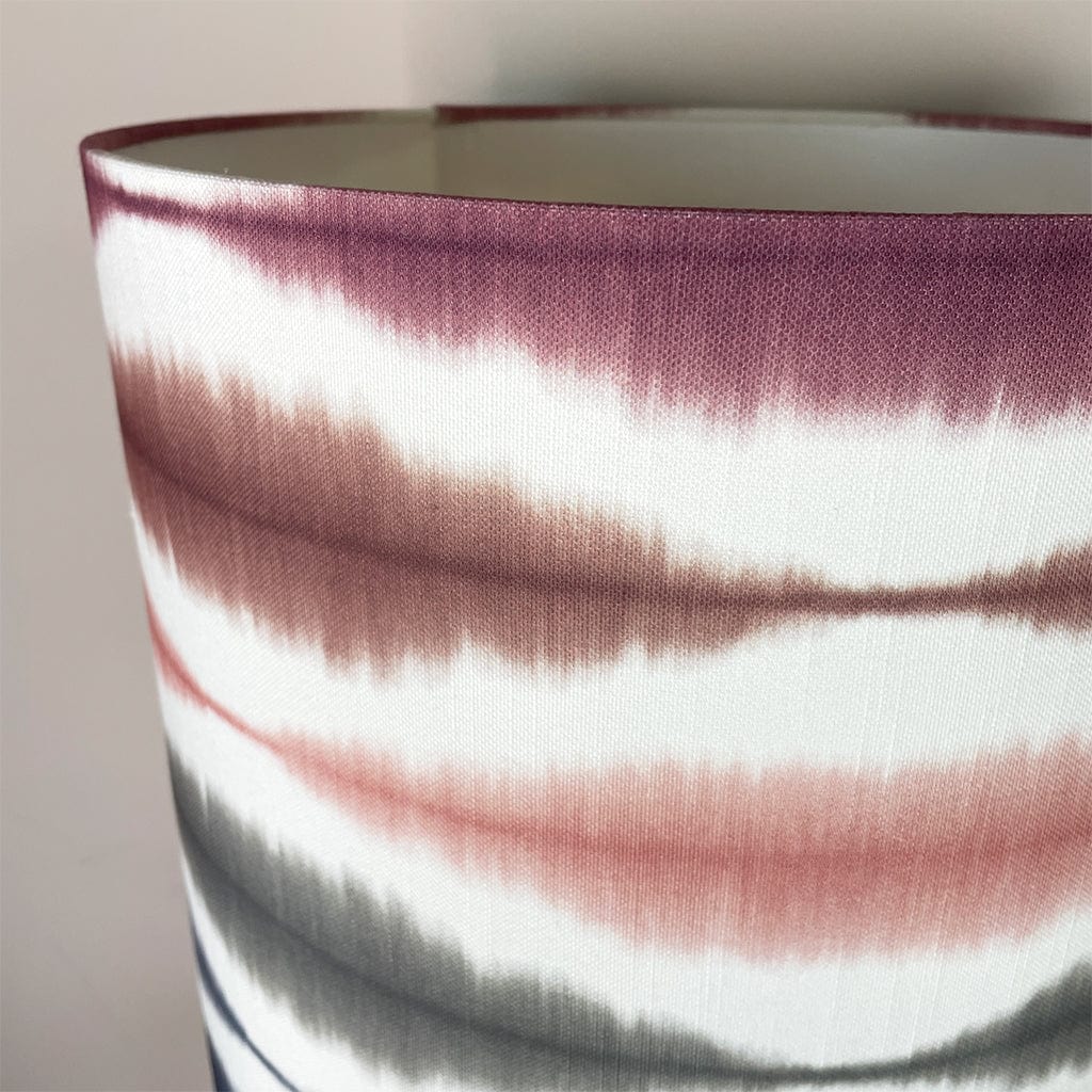 The handcrafted Usuko lampshade features a striking ikat-inspired pattern in soft cranberry, rose, navy and sage tones, layered over a white backdrop to enhance its fluid, painterly effect. The deep drum shape offers a contemporary edge, and the crisp white lining ensures a beautiful glow when lit.