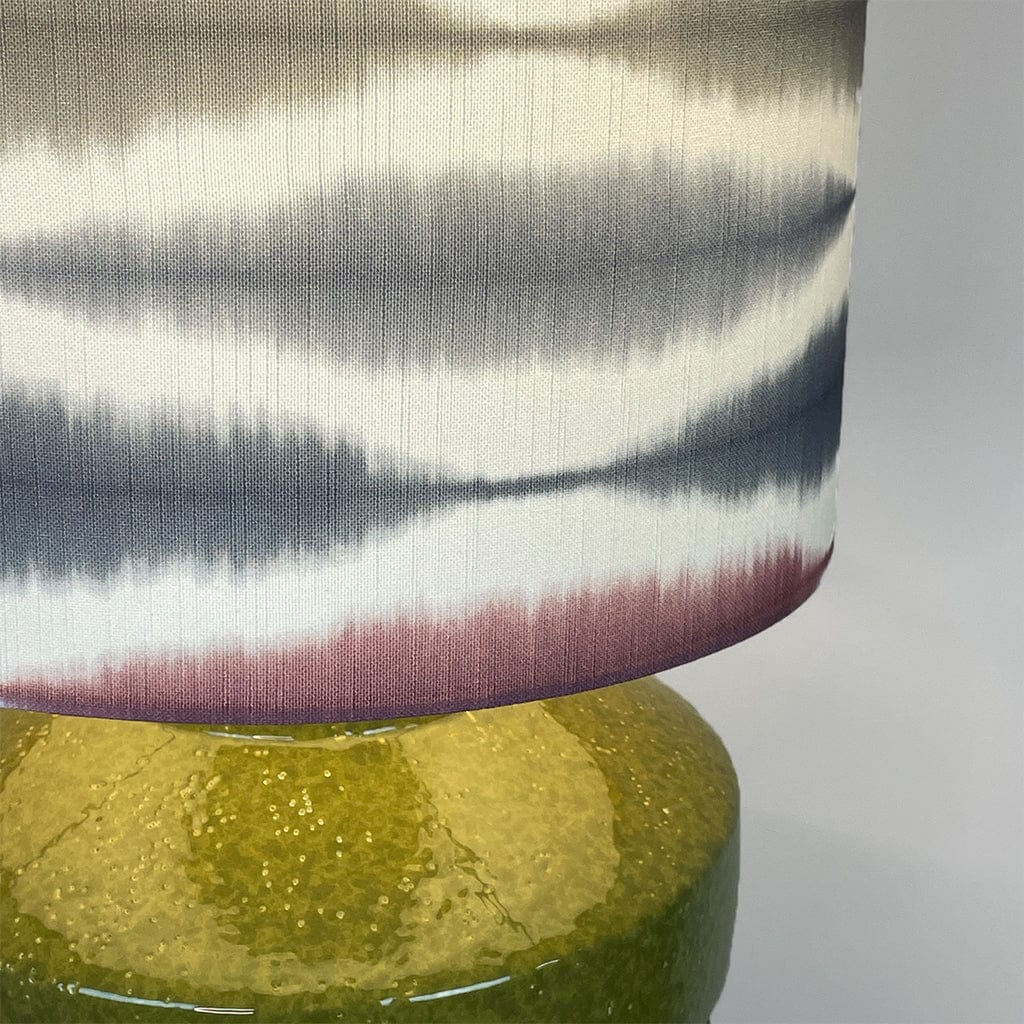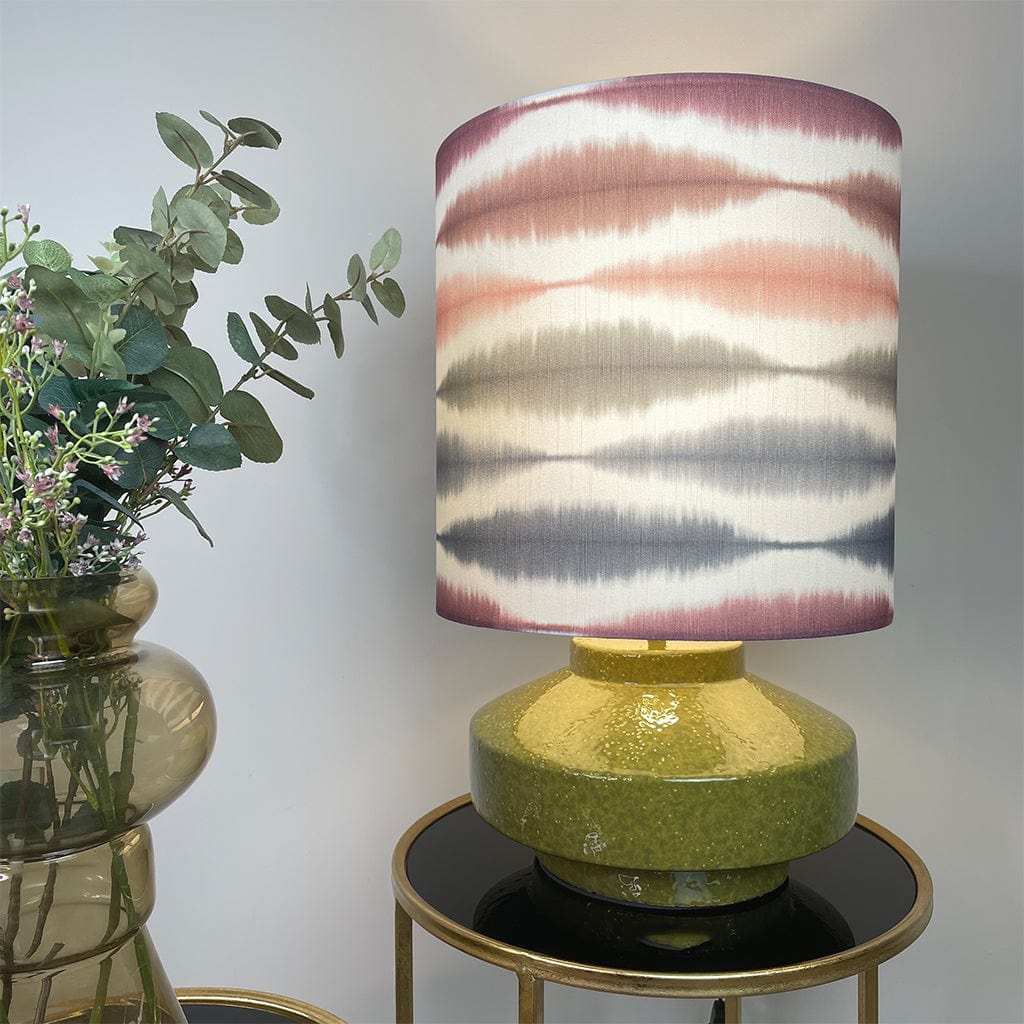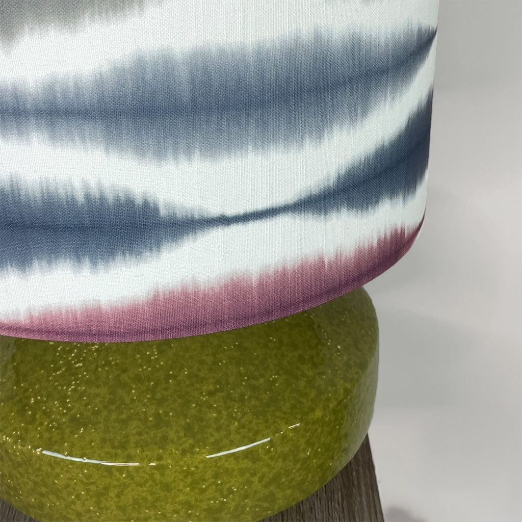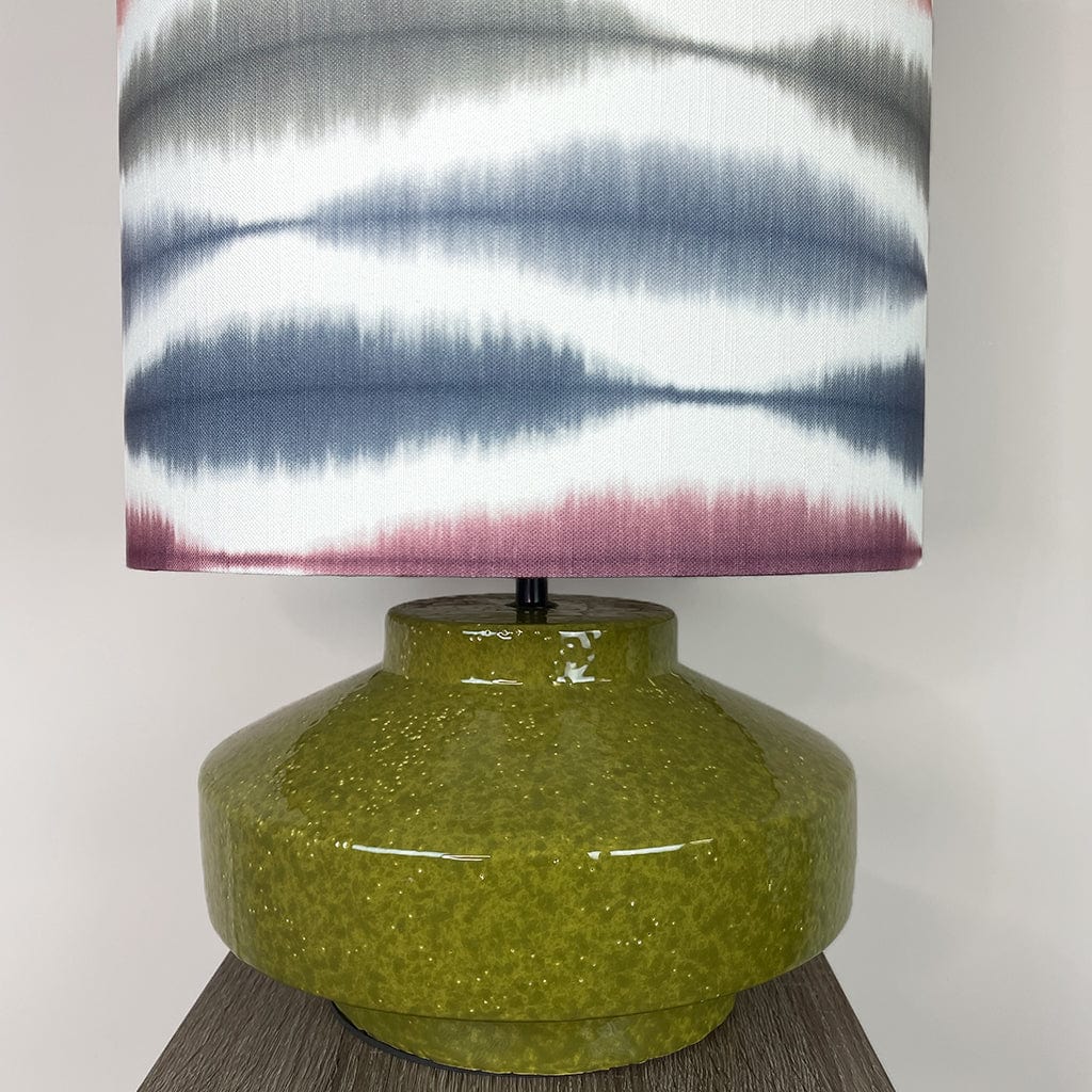 The handcrafted Usuko lampshade features a striking ikat-inspired pattern in soft cranberry, rose, navy and sage tones, layered over a white backdrop to enhance its fluid, painterly effect. The deep drum shape offers a contemporary edge, and the crisp white lining ensures a beautiful glow when lit.