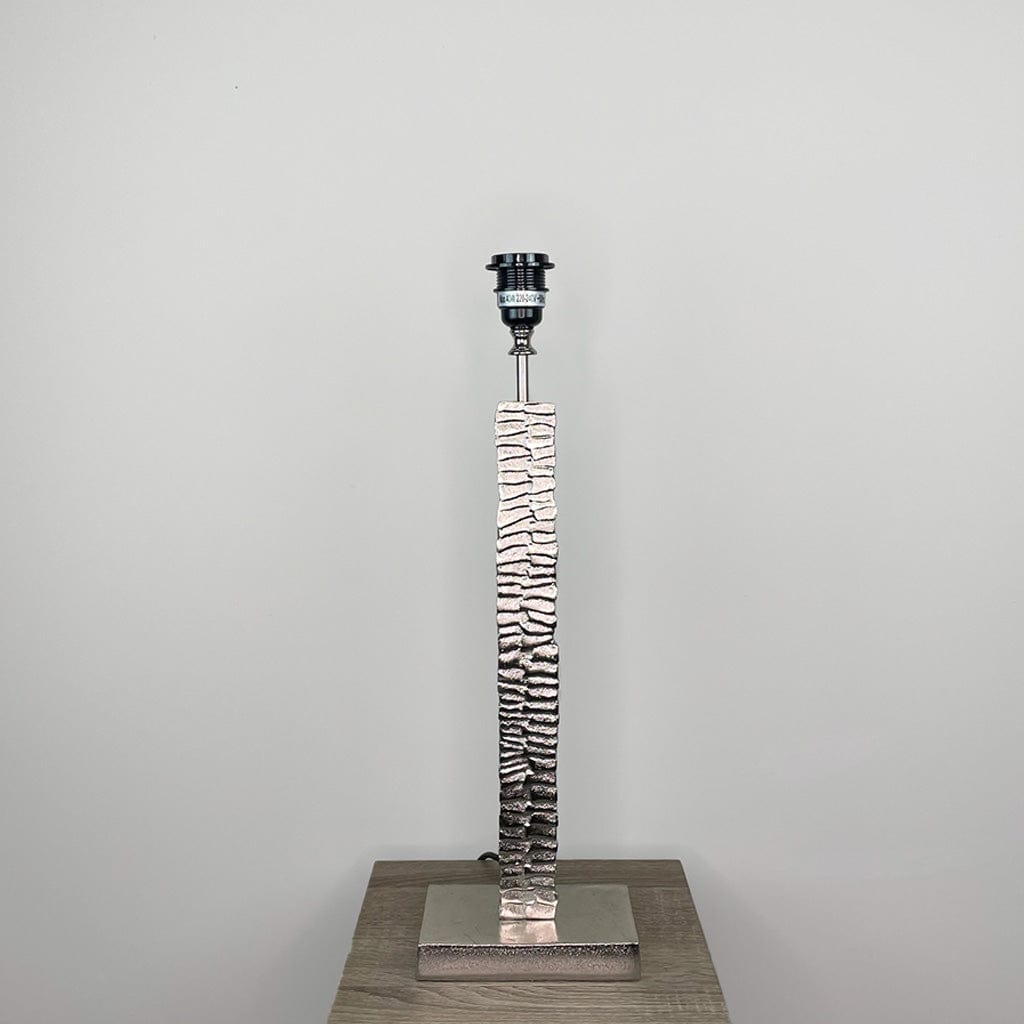 The design of the Paperbark range of lamp bases has been inspired by the flaking bark of the Paperbark Maple tree and rendered in cast aluminium. This table lamp is finished in luxuriant silver. Available as base only or with a selection of Rocke shades, here we offer a few handcrafted rectangle shades for you to choose from.