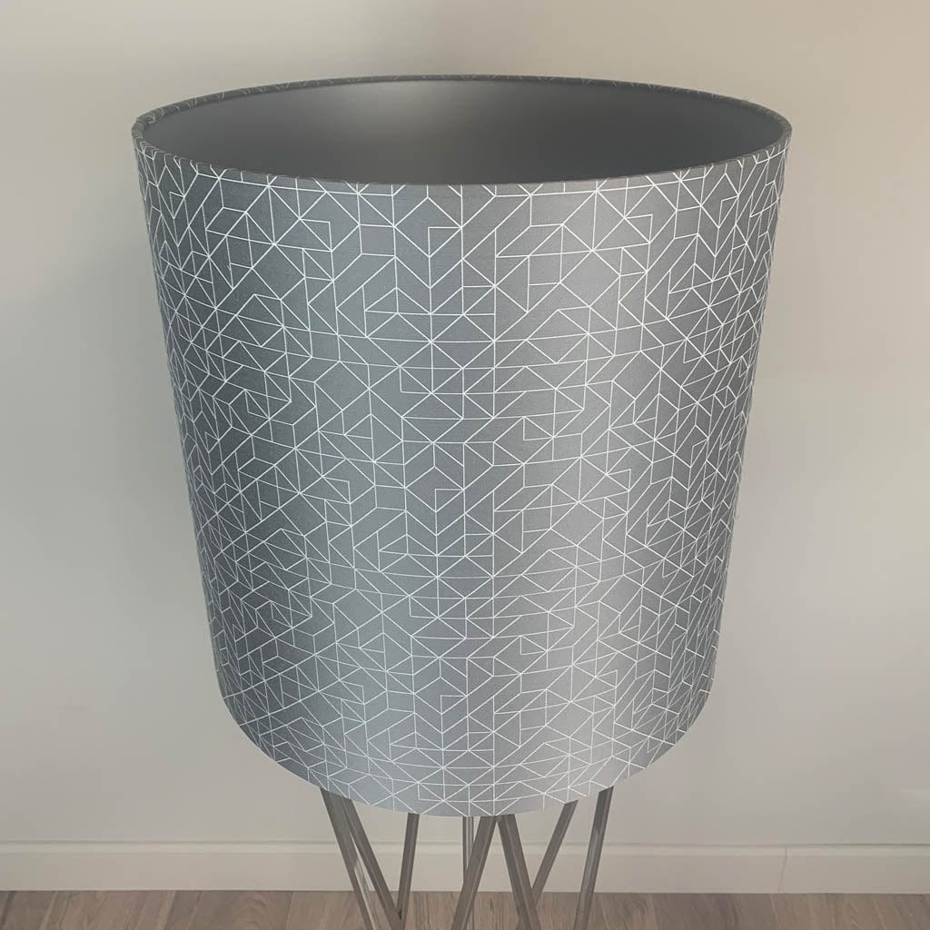 Silver Geo Deep Drum: This tall deep drum lampshade balances the proportions of our Renzo floor lamp. The random geometric patterning on the silvery grey fabric with a subtle satin sheen is embroidered with white thread lines. The design plays with scale as it mirrors the pattern of the floor lamp in a smaller scale. The champagne backing perfectly complementing the fabric. A statement piece that nods to an upmarket boutique hotel vide and adds sophistication to any room.