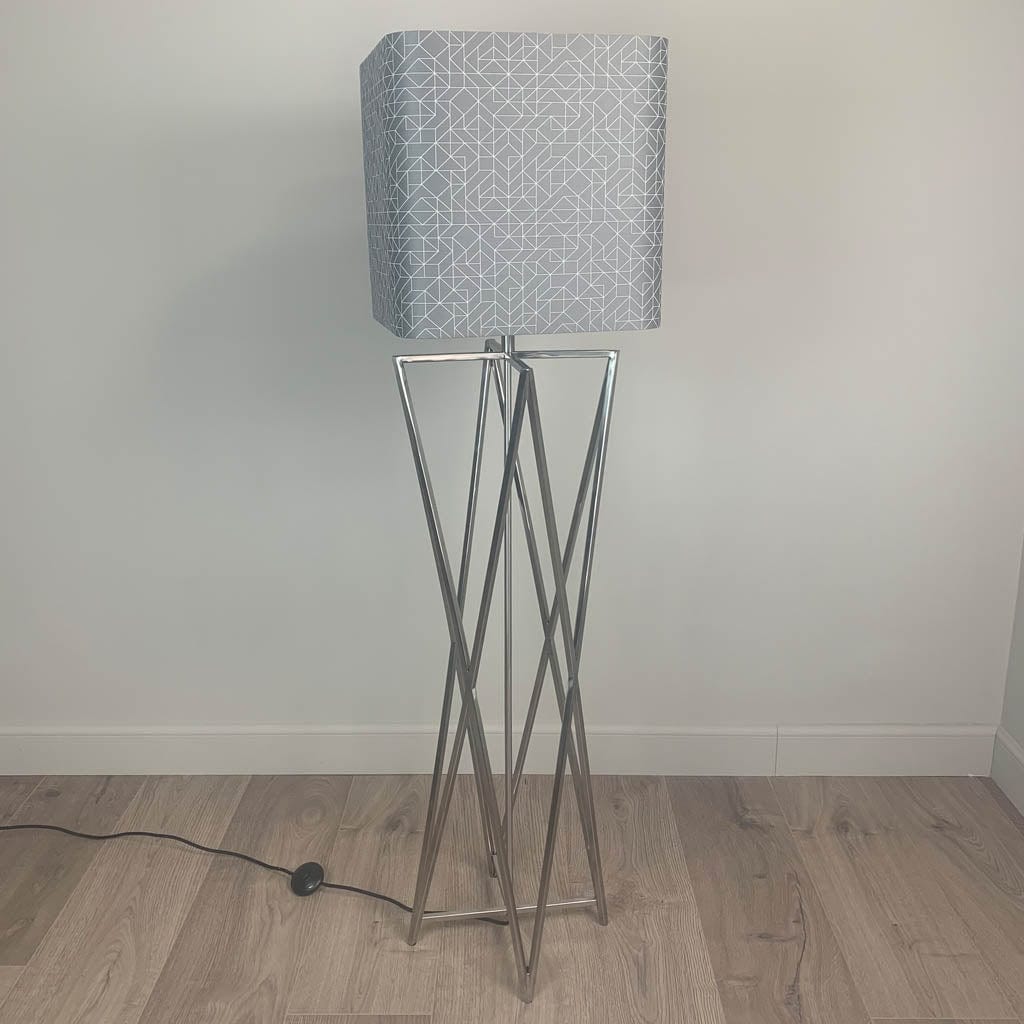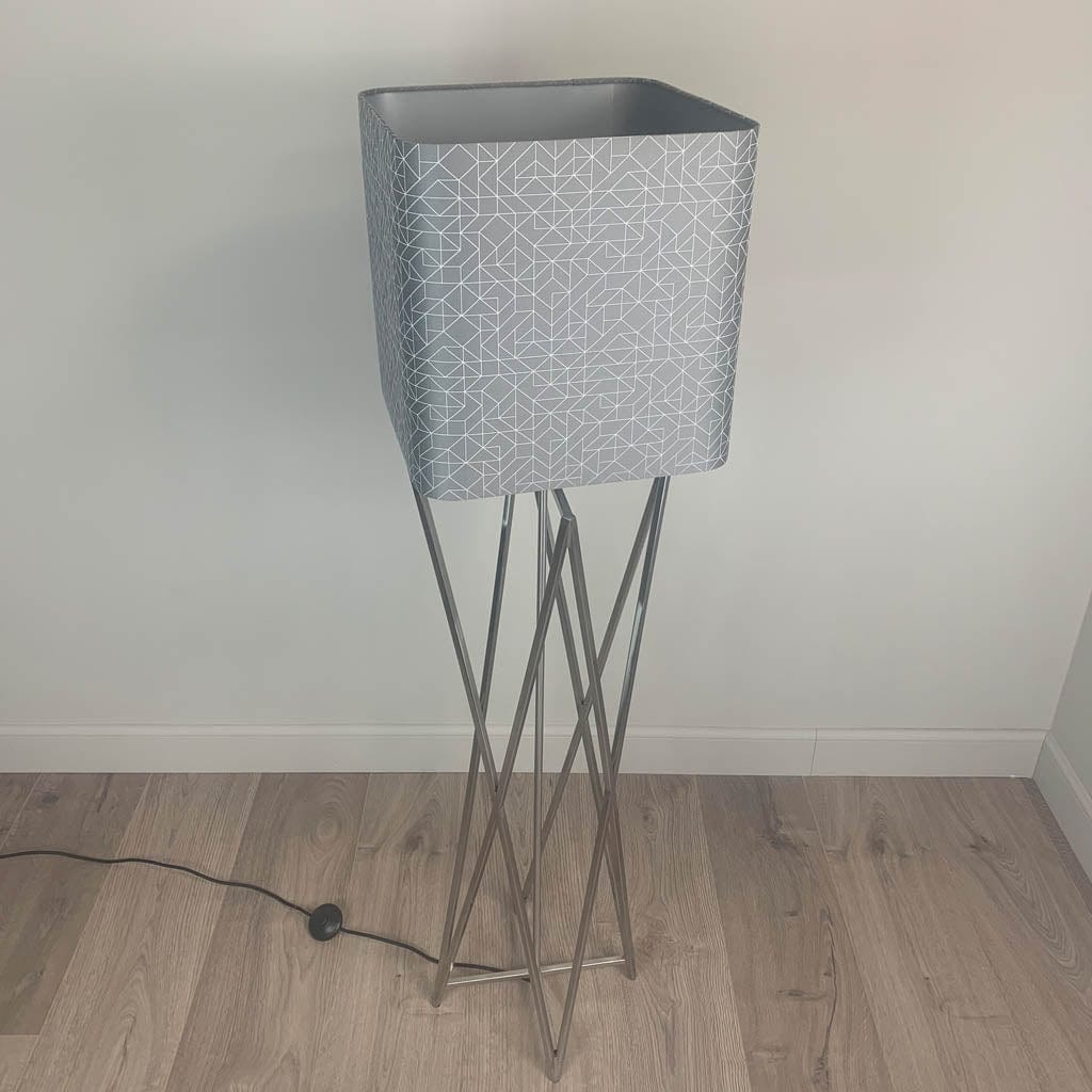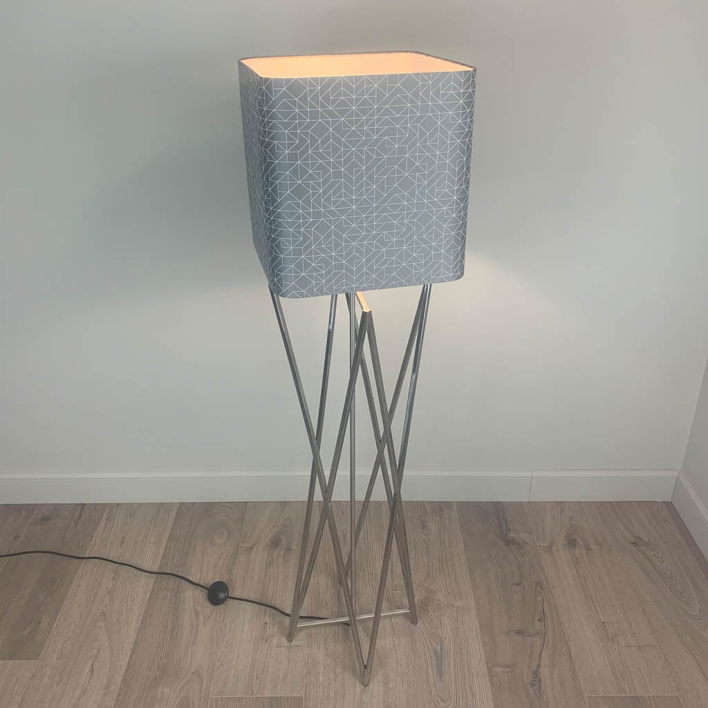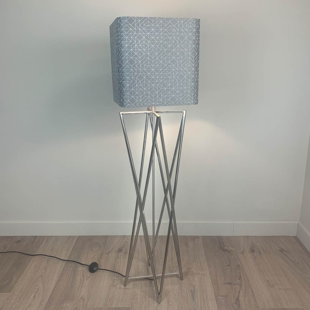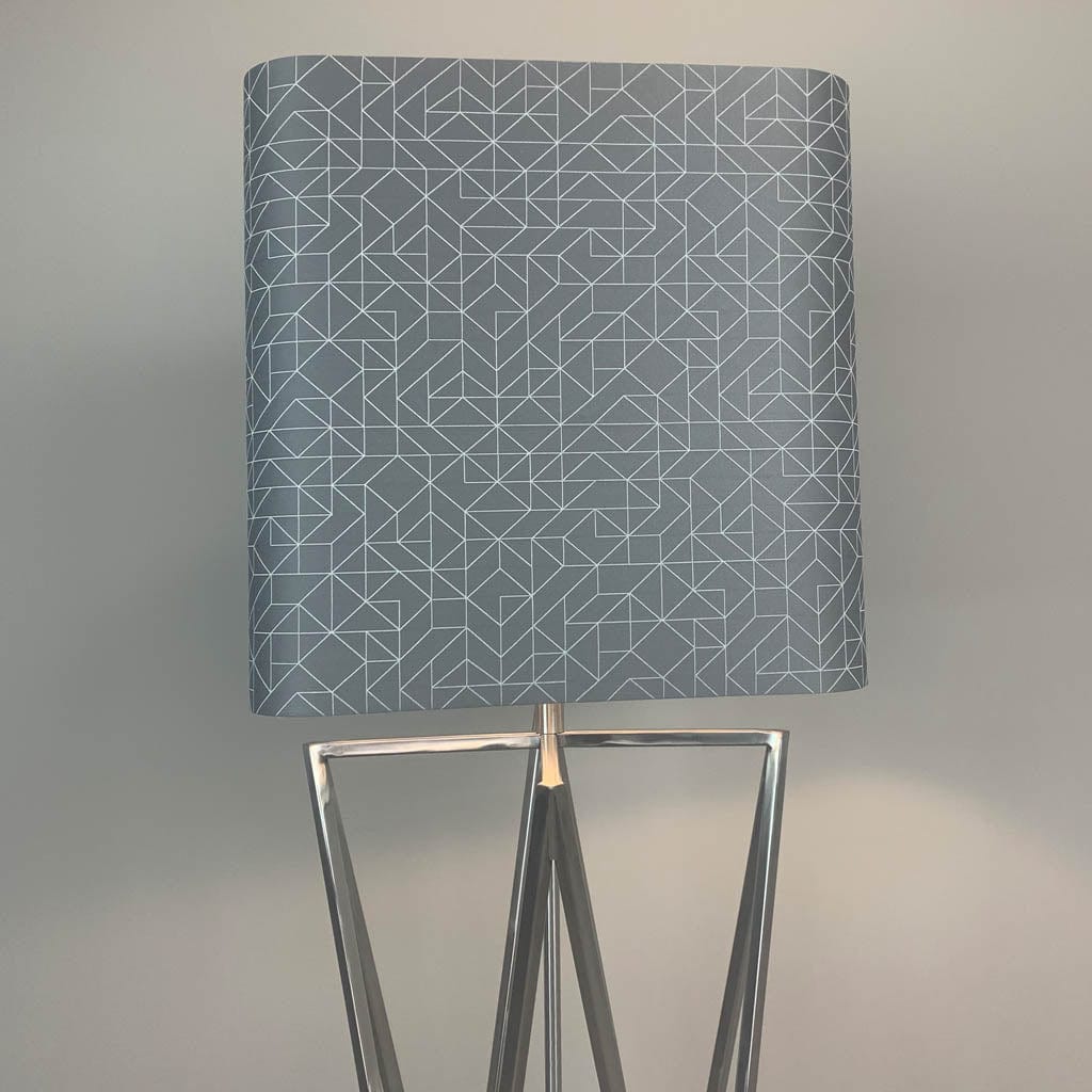 Silver Geo SquareThe unusual shape of this rounded rectangular lampshade echoes the shape of our Renzo floor lamp. The random geometric patterning on the silvery grey fabric with a subtle satin sheen is embroidered with white thread lines. The design plays with scale as it mirrors the pattern of the floor lamp in a smaller scale. The champagne backing perfectly complementing the fabric. A statement piece that nods to an upmarket boutique hotel vide and adds sophistication to any room.