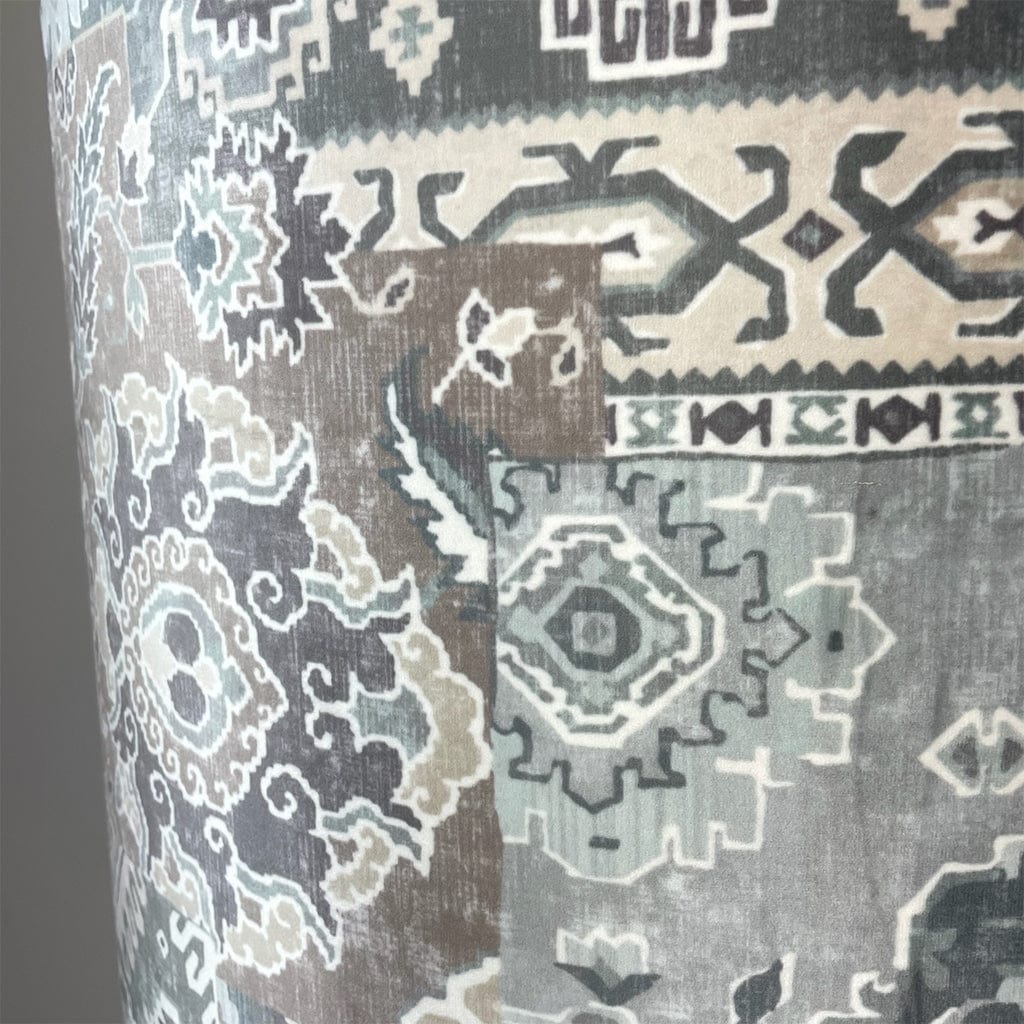 Kilims (Turkish / Persian rugs) are renowned for their geometric patterns, angular motifs and stripes, all of which are represented in this stunning velvet fabric. Kilim inspired fabrics have a universal timeless appeal and can work in any home setting, like this Chalet Glacier fabric. We have paired this cool-tone, soft touch velvet with a bold floor lamp to create a statement piece in any corner.