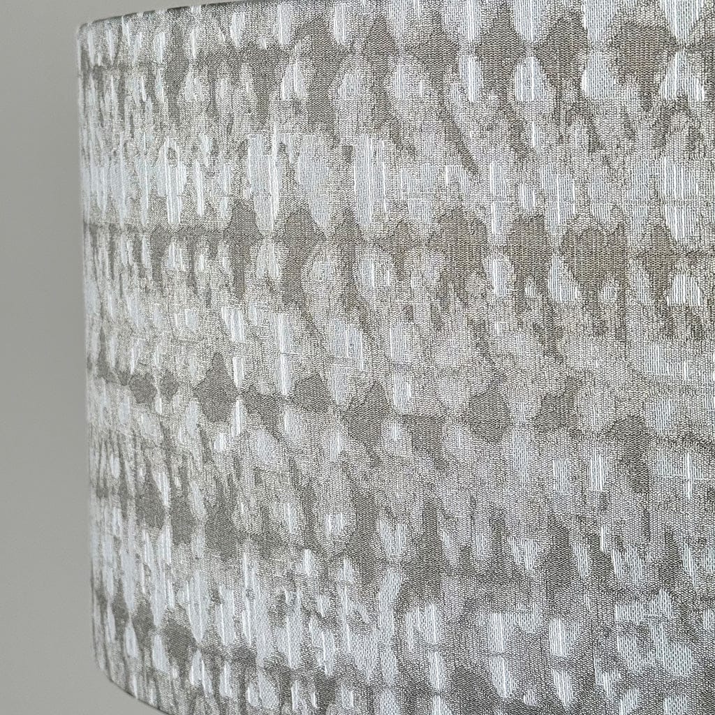 This Rocke Bespoke handcrafted lampshade, made in our studio. This striking fabric showcases a softly diffused, ikat-style design in shimmering silver tones layered over crisp white, giving it a modern yet artisanal character. The subtle variation in colour adds depth and movement, while the white lining creates a clean, luminous glow when illuminated.