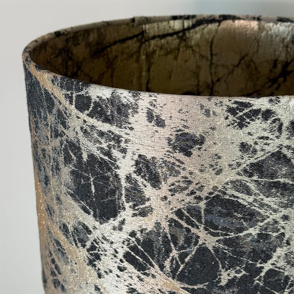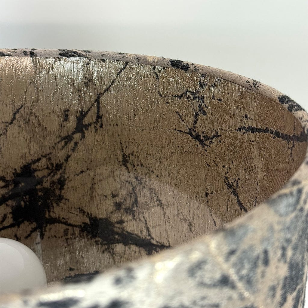 This Rocke Bespoke handcrafted lampshade, made in our studio. This fabric features earthy bronze tones with deep, molten-inspired accents that create a dynamic, textured effect. It's warm, organic colour palette evokes the look of flowing lava, offering a bold yet sophisticated statement for interior accents. Paired with a clear lining that allows the gold reverse of the fabric glow when lit.