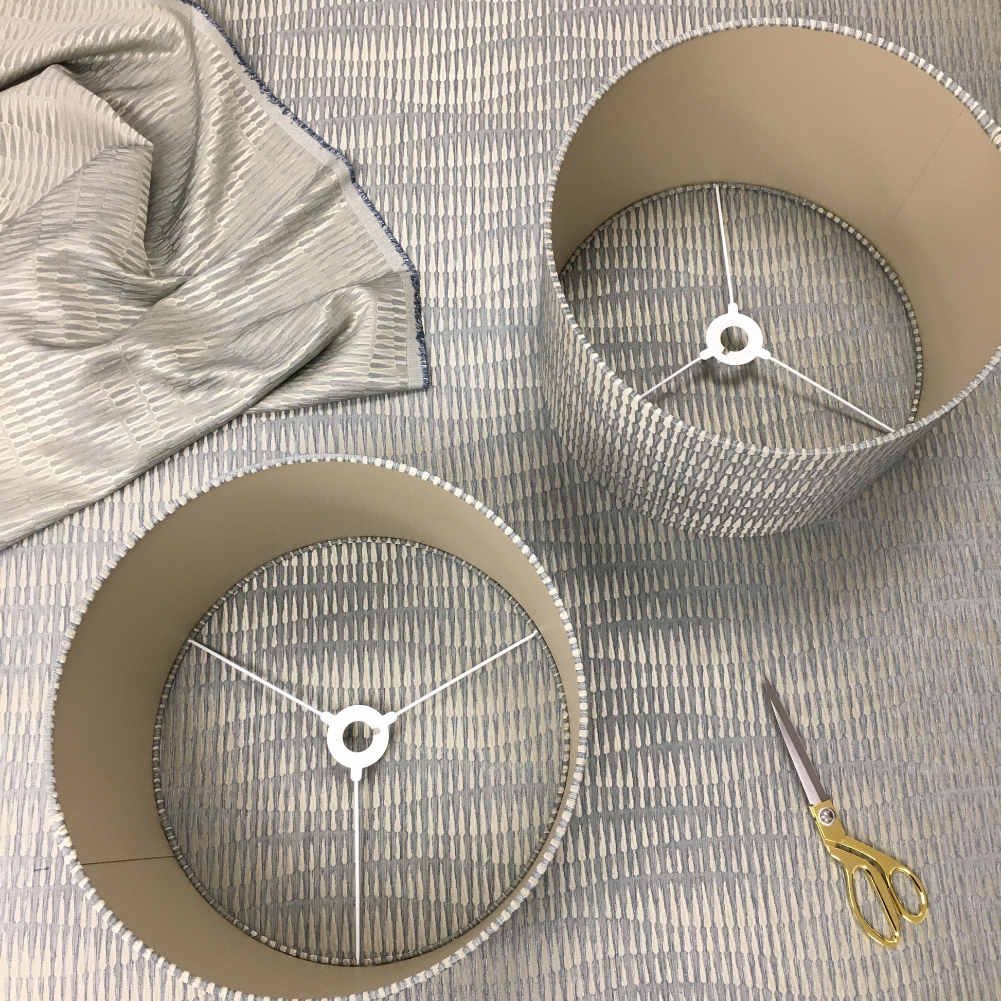 This Rocke drum shade is made with a Giotto Moonlight fabric, lined with matt champagne. This textured fabric features an effervescent glow between light denim blue and shining champagne tones.