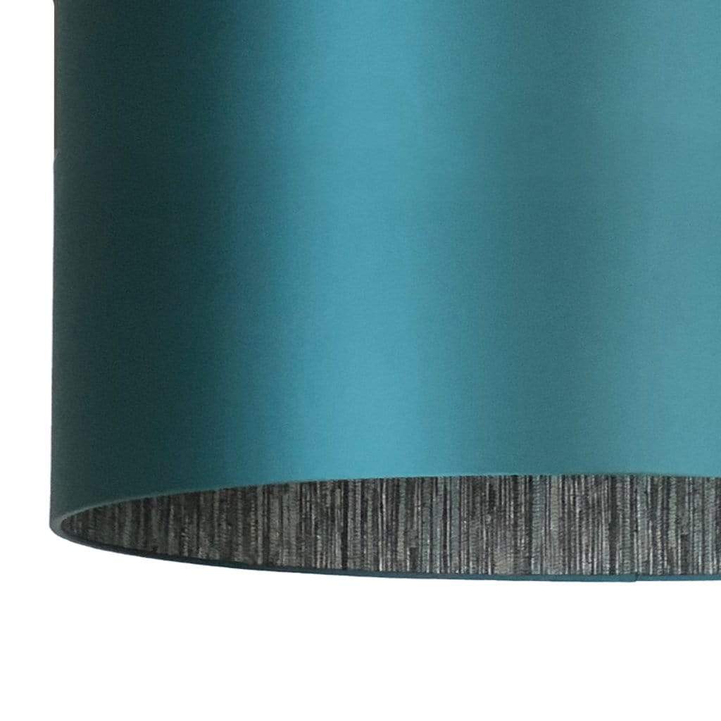 Rocke drum or shallow shade in an elegant Teal Green Satin look fabric on the outer, perfectly paired with Anthology wallpaper lining. The Seri Slate wallpaper creates a textured finish, to give the appearance of hessian & captures the light beautifully, whilst adding depth and a multi tonal feel to the inner of the shade. The wallpaper lining has a real mix of interwoven greys, metallics and hints of teal which are the perfect partner for the jungle teal sating outer.