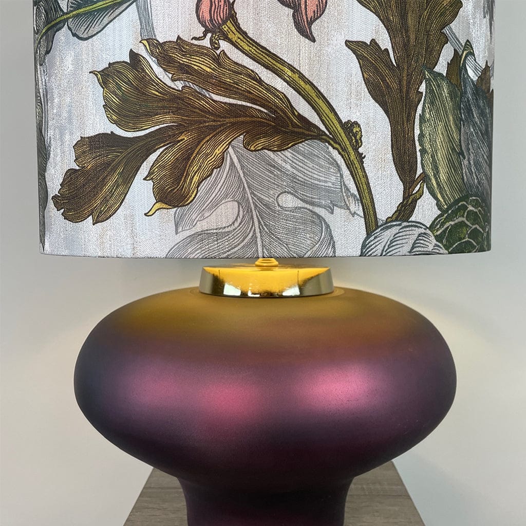 This exclusive Rugari Enamel Sangria Finish Glass Table Lamp is paired with a luxurious Rocke Bespoke lampshade in Timorous Beasties Epic Botanic Beige Peach fabric. The jacquard shade showcases bold floral motifs in warm ochres, soft peaches, and natural beige tones, woven into a rhythmic botanical pattern with a subtle sheen. The rich sangria enamel base combined with this elegant botanical shade creates a sophisticated statement piece, perfect for adding warmth and style to any room.
