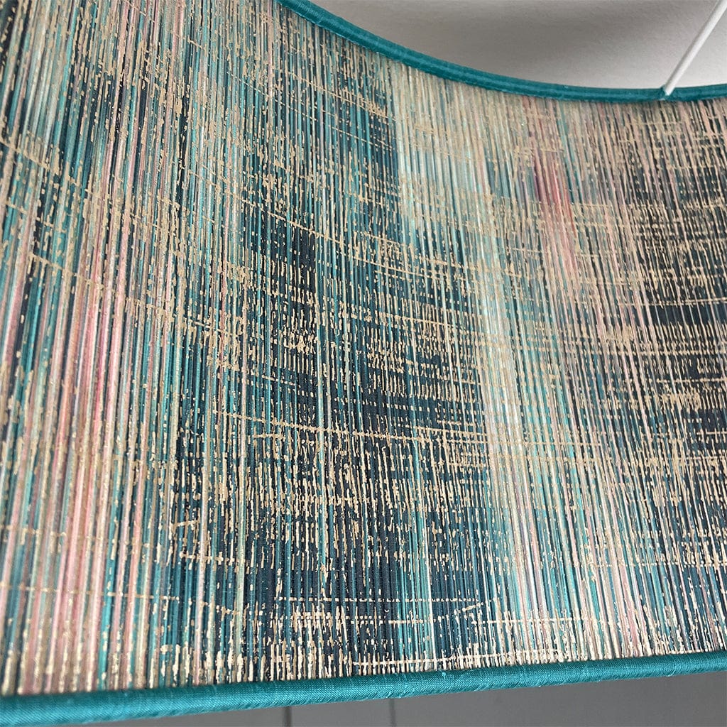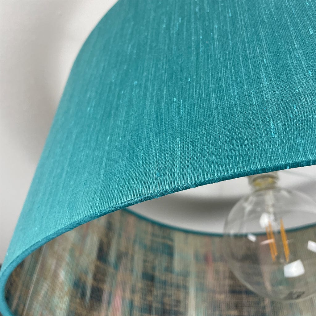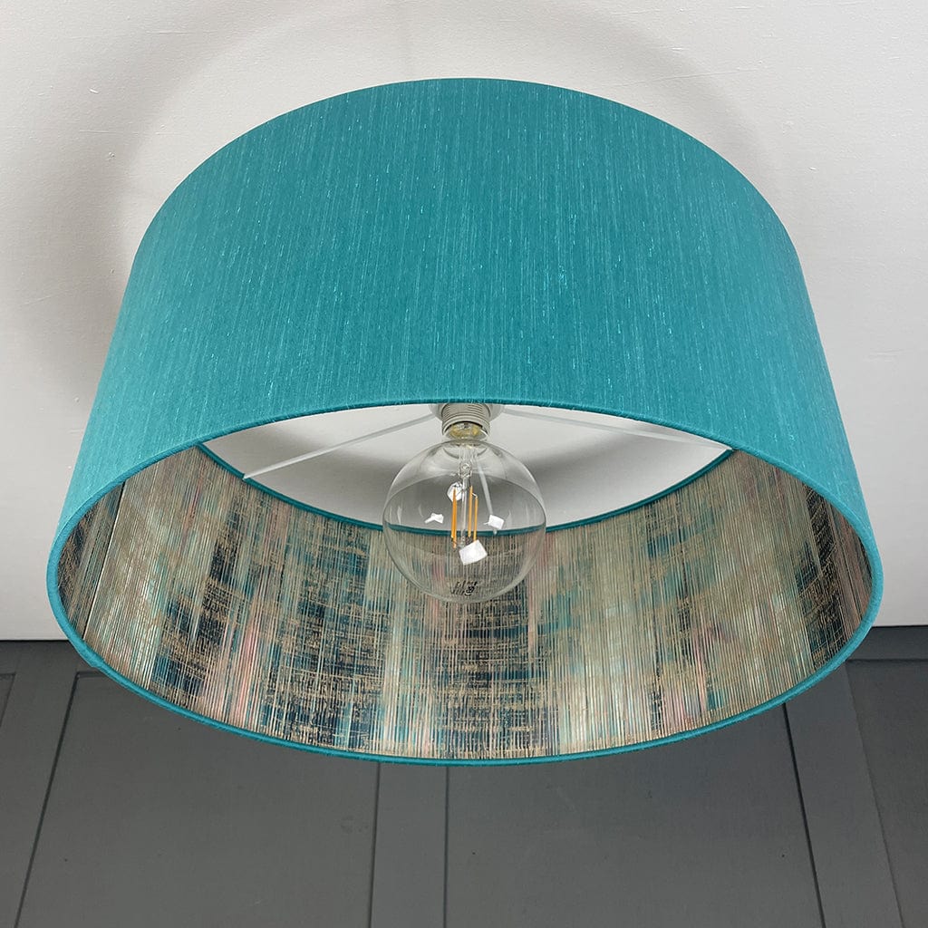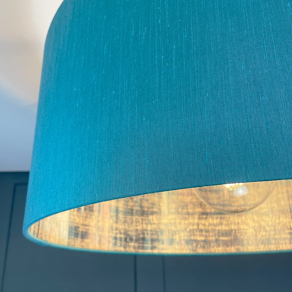 Brighten up your interiors with this vibrant pendant lampshade, featuring a bold outer fabric in Tussah Peacock - a richly textured turquoise blue that adds instant freshness to any space. Inside, the Serengeti Mineral lining creates a beautiful contrast, with shimmering streaks of mineral blue, bronze, and soft neutral tones. This combination delivers a playful pop of colour with elegant depth, making it perfect for contemporary living rooms, bedrooms, or feature hallways.